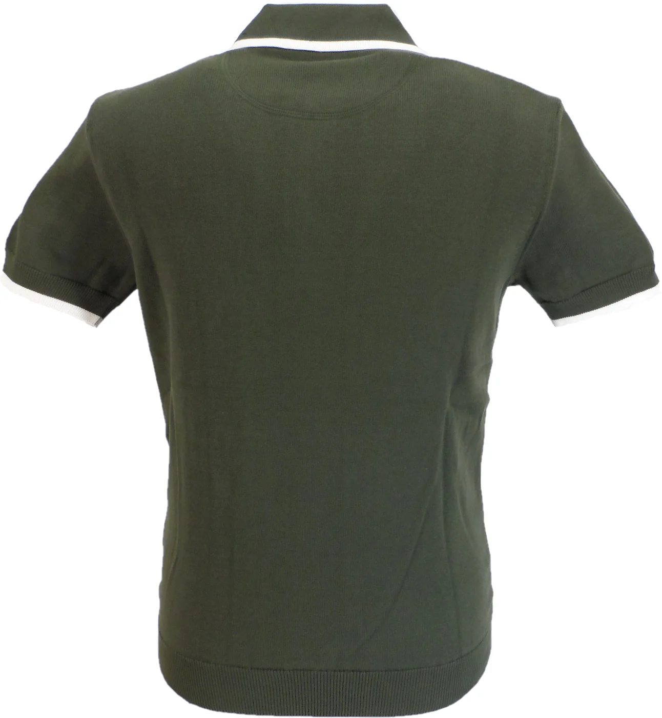 Trojan Mens Army Green Zip Stripe Fine Gauge Zipped Knitted Polo Shirt