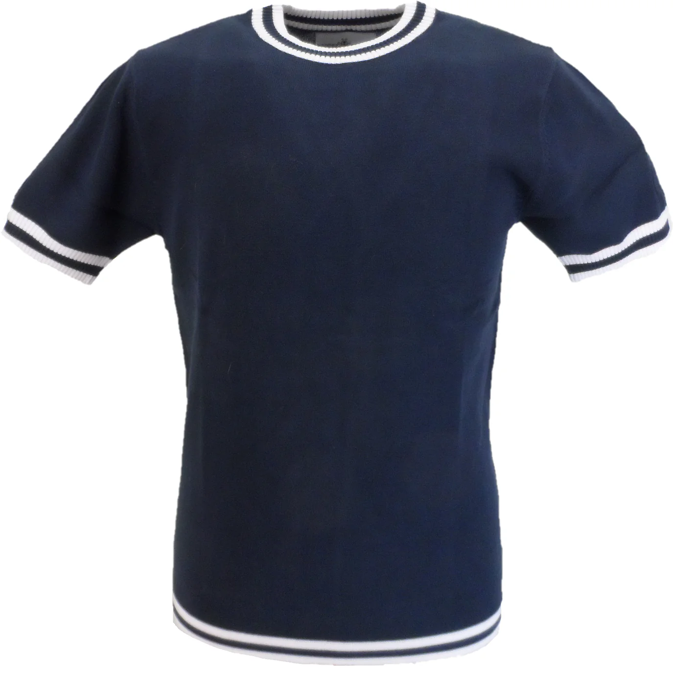 Madcap England Mens Navy Blue Stripe Short Sleeve Mod Knit Jumper