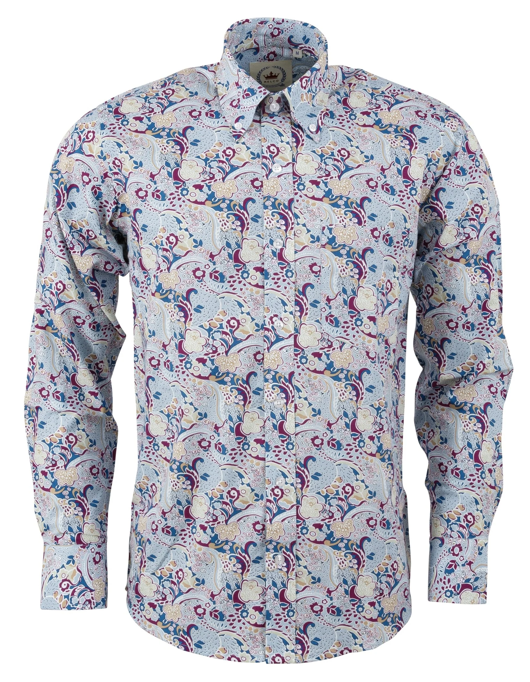 Relco Light Blue Multi Paisley Long Sleeved Retro Mod Button Down Shirt