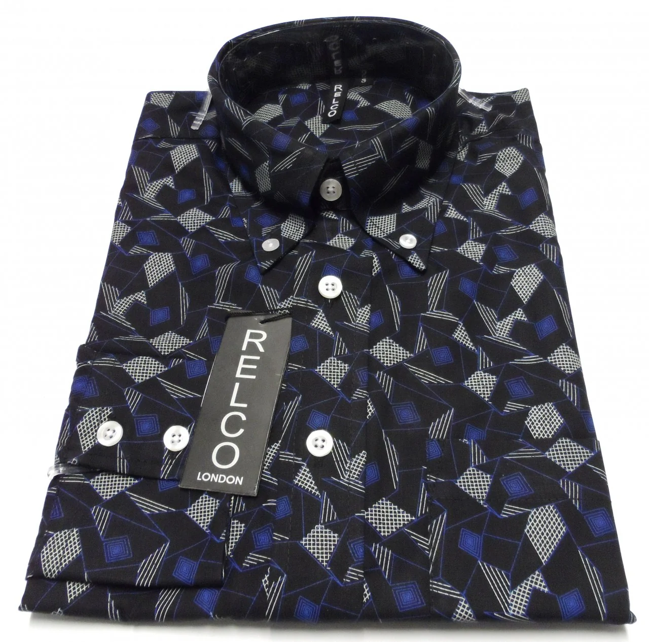 Relco Black Blue Print Cotton Long Sleeved Retro Mod Button Down Shirts