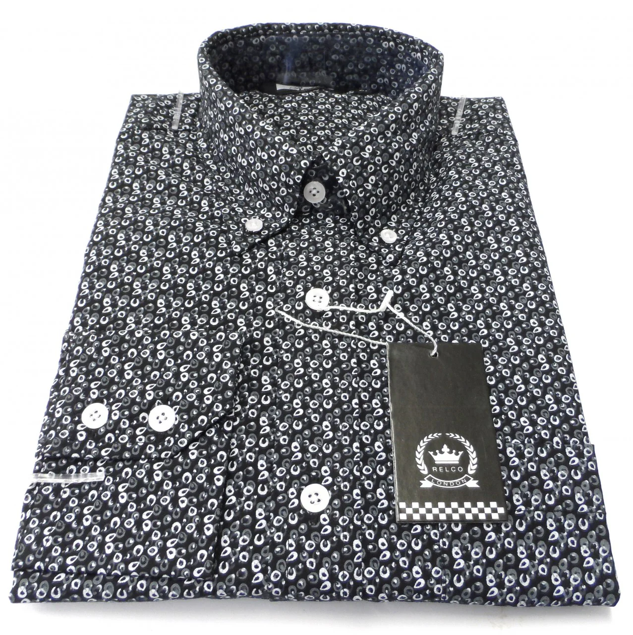 Relco Black/Grey Print Cotton Long Sleeved Retro Mod Button Down Shirts