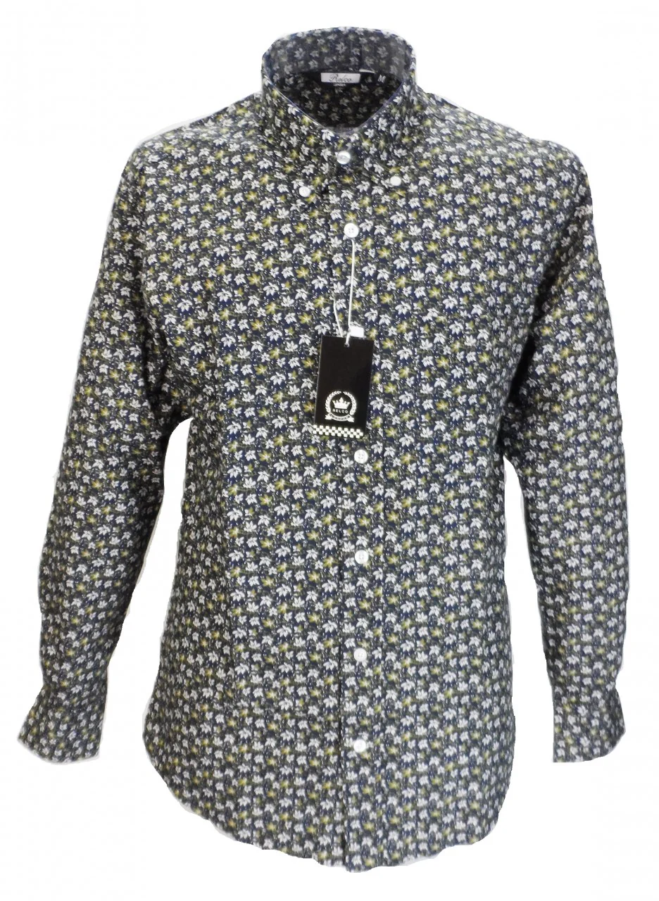 Relco Navy Olive Floral Cotton Long Sleeved Retro Mod Button Down Shirts