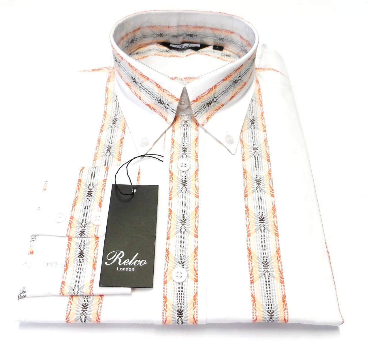 Relco Off White Orange Striped Cotton Long Sleeved Retro Mod Button Down Shirts