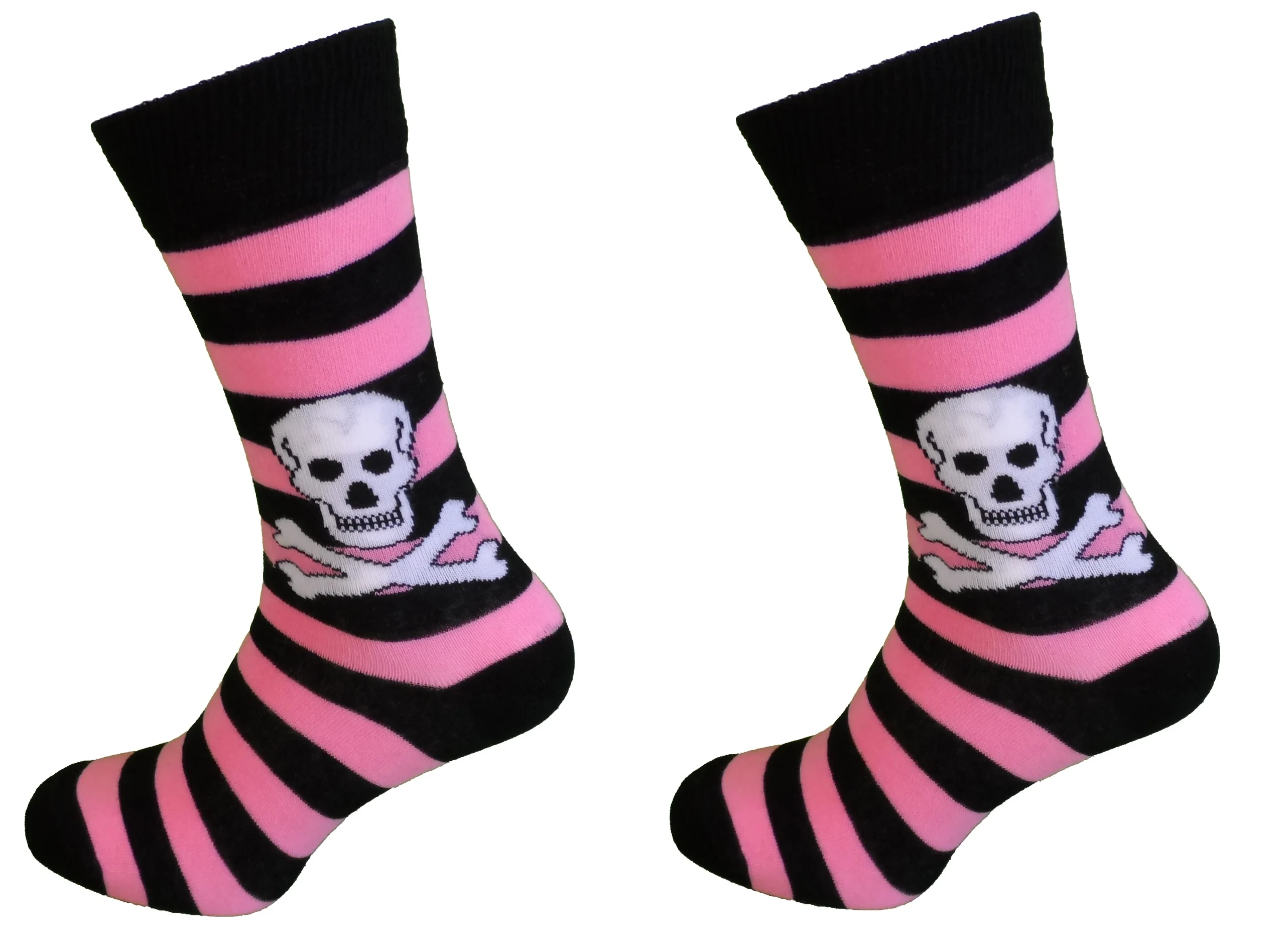 LADIES 2 PAIR Pink STRIPED SKULL AND CROSSBONE SOCKS