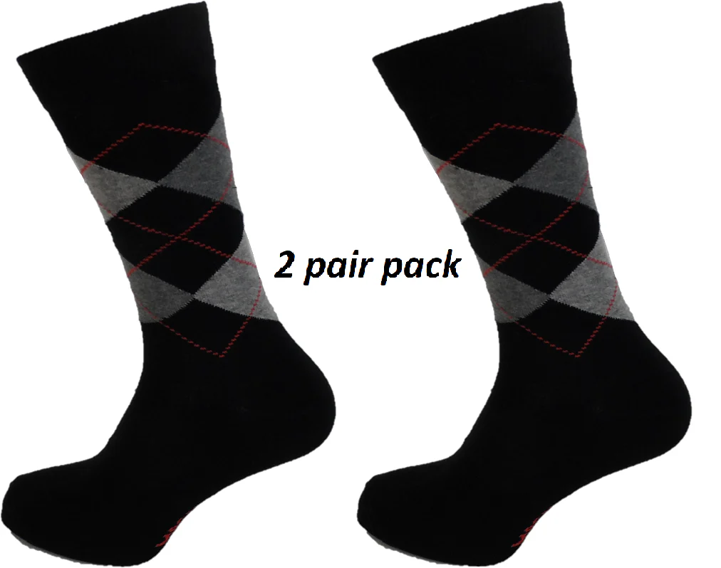 Mens 2 Pair Pack of Black/Grey/Red Argyle Patterned Socks