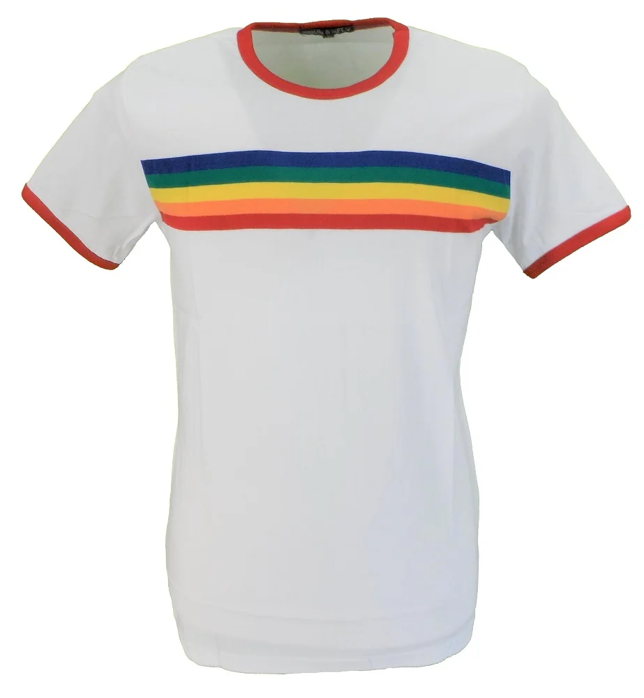 Run & Fly Mens White Retro Mod 60s Indie Rainbow Striped Cotton T Shirt