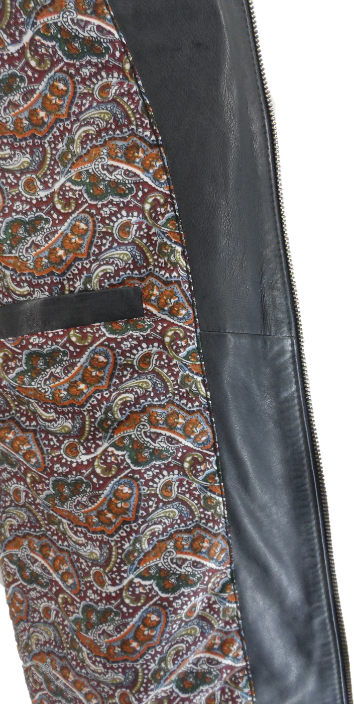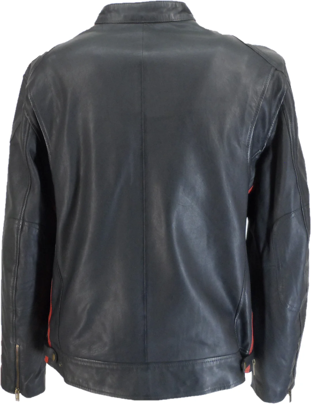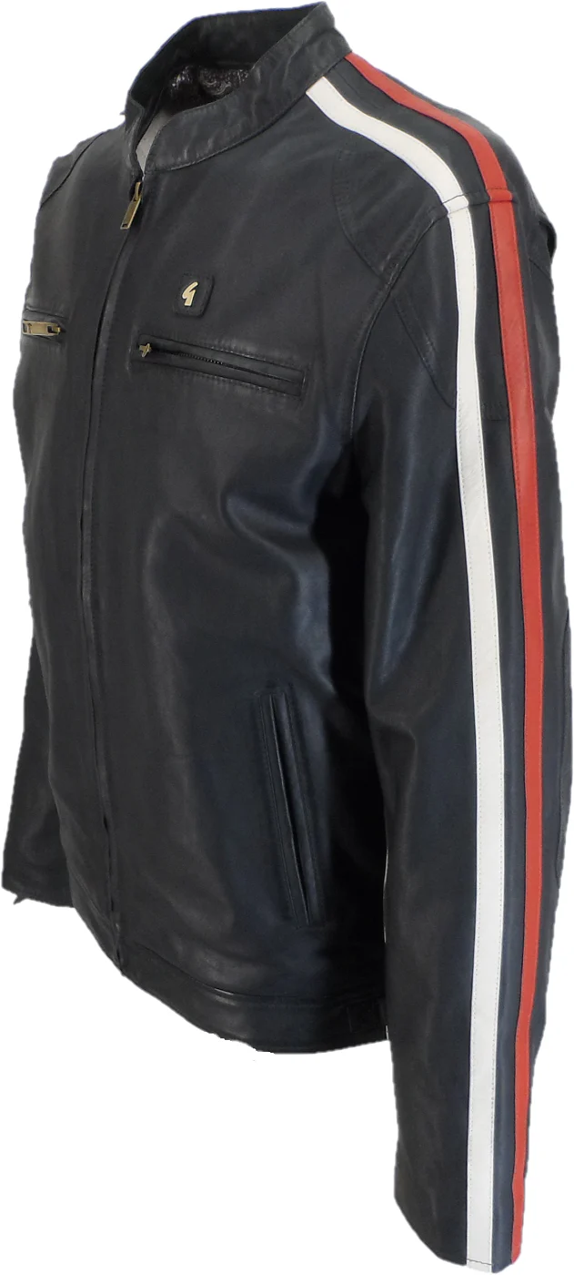 The Gabicci Moto men’s leather jacket captures the timeless style seen in the film Le Mans, making it an essential addition for anyone seeking a sleek, modern biker look. Inspired by the Classic Racing Style popularized by McQueen, it features two side pockets and 2 Chest Zipped Pockets, one internal pocket lined with a paisley print, and bold, color-matched racing stripes. The buttoned collar completes this iconic piece, celebrating a heritage that continues to inspire.