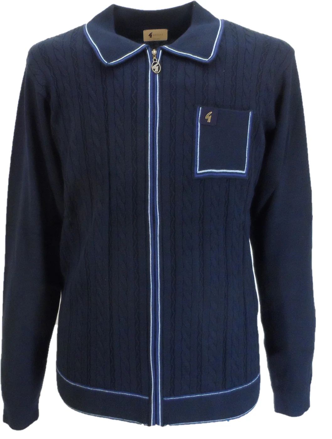 Gabicci Vintage Mod polo features a classic long-sleeve design with a retro textured pattern on the front and a branded Gabicci zipper. Crafted from a super-soft cotton blend, it offers ribbed cuffs and hem for a comfortable fit. The gold antique ‘G’ emblem on the chest adds a stylish touch, making this cardigan ideal for staying warm and fashionable during colder months.