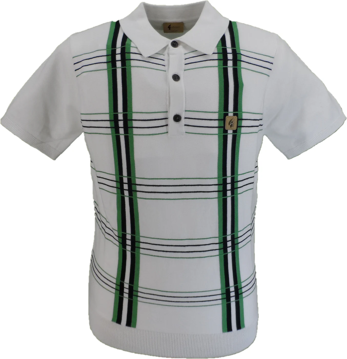 Gabicci Vintage Miller Mod polo. An authentic Mod design this polo takes inspiration from the classic 60s polo cardigan, typically seen with vertical stripes down the front. Contrasting stripes adorn the front of this short-sleeve polo. Ribbed fold down trimmed collar adds the overall Mod feel.