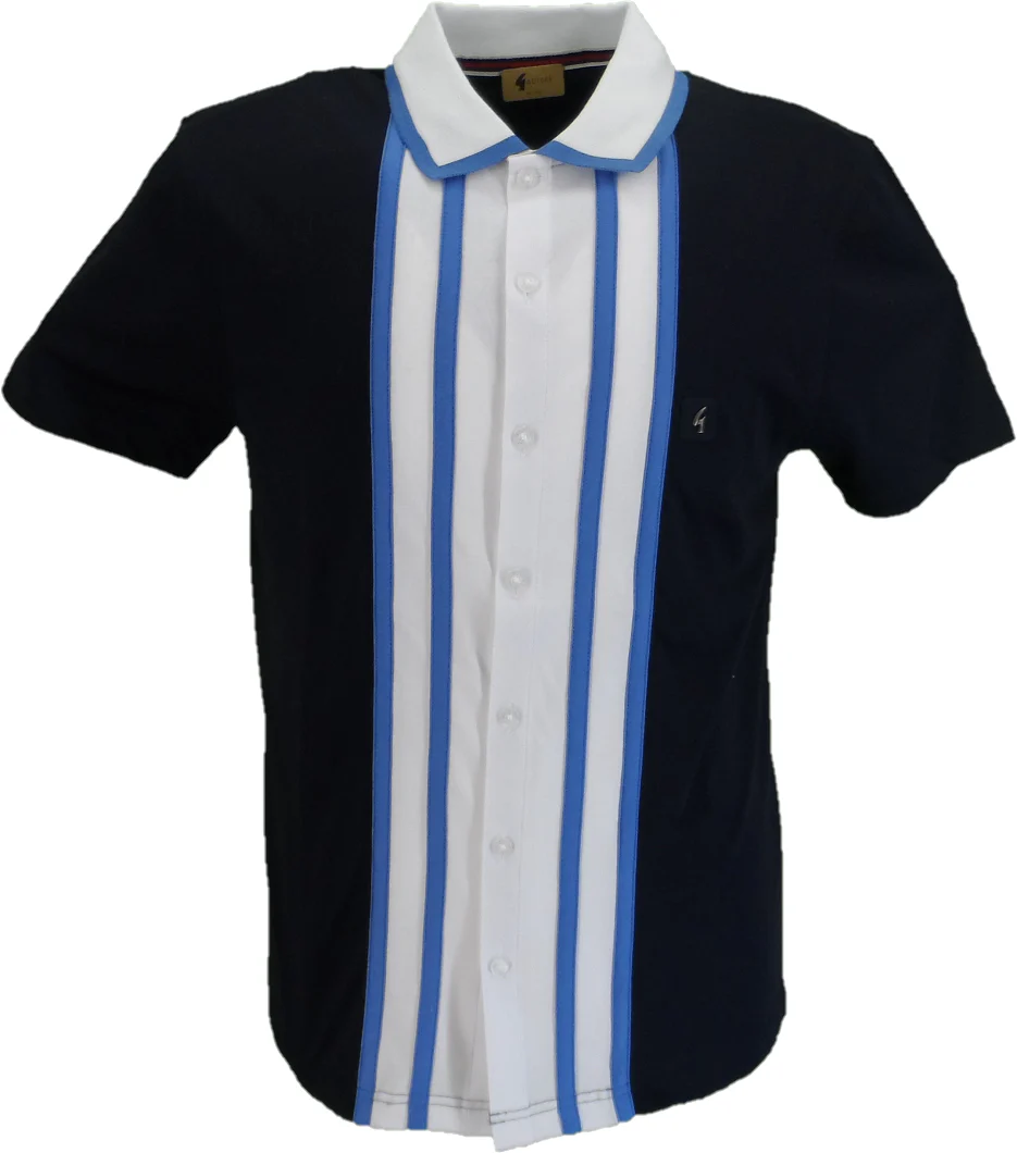 Gabicci Vintage Geo Print Mod polo. An authentic Mod design this polo takes inspiration from the classic 60s polo Shirts, Contrasting Geo Print adorn the front of this short sleeve polo. Ribbed fold down trimmed collar adds the overall Mod feel
