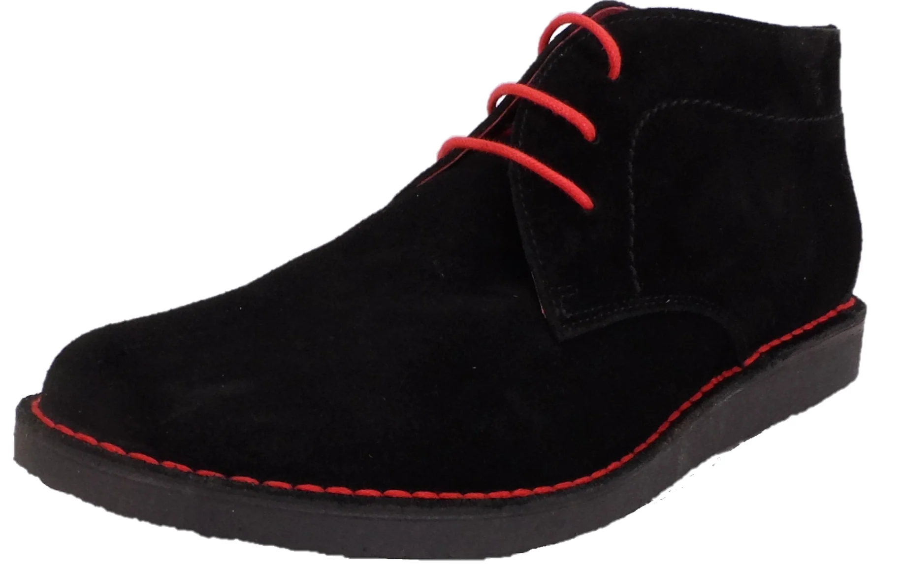 Real leather upper, with 3 eyelets lacing in suede leather upper with red stitching and a vulcanised rubber sole and a leather lining. comes with both red and Black Laces
