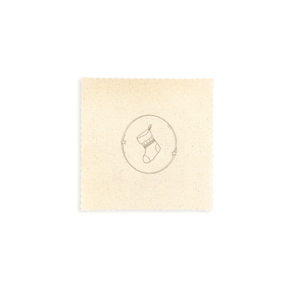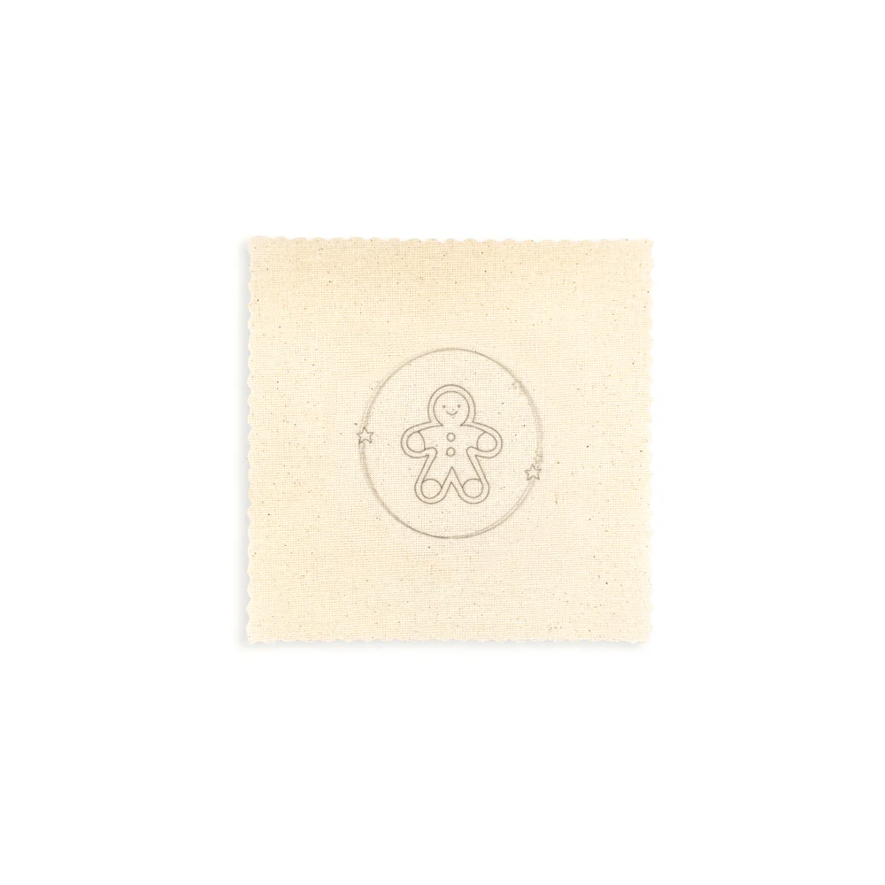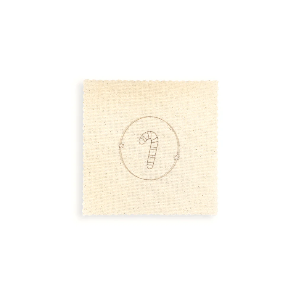 – 4 Telas crea de 15 x 15 cm pre marcadas con clásicos de la temporada: botita, regalo, galleta de jengibre y bastón de caramelo.