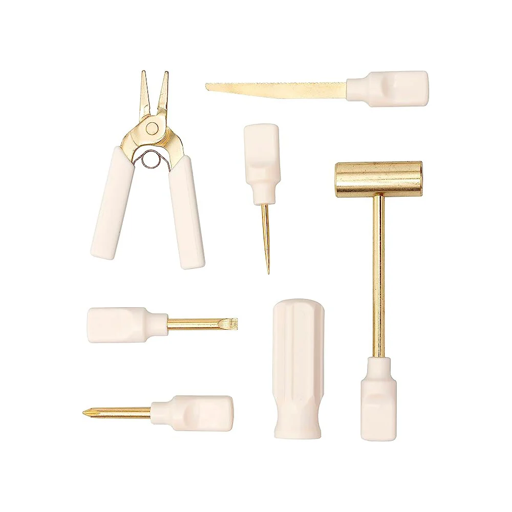 Incluye: 1 destornillador plano»,»1 destornillador de estrella»,»1 martillo»,»1 punzón»,»1 tenazas»,»1 mini sierra con mango extraíble y un estuche para guardarlo todo.