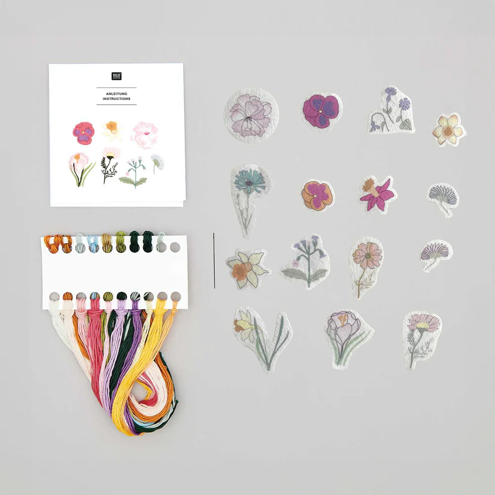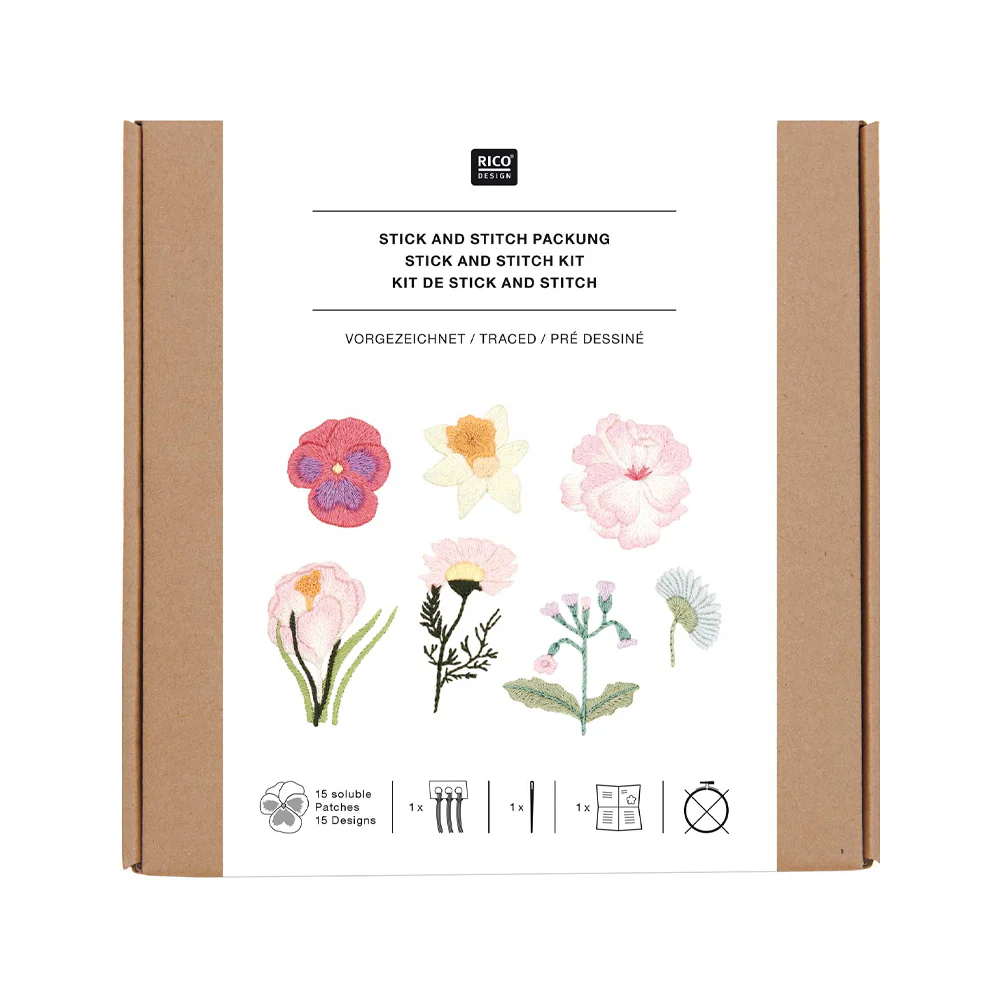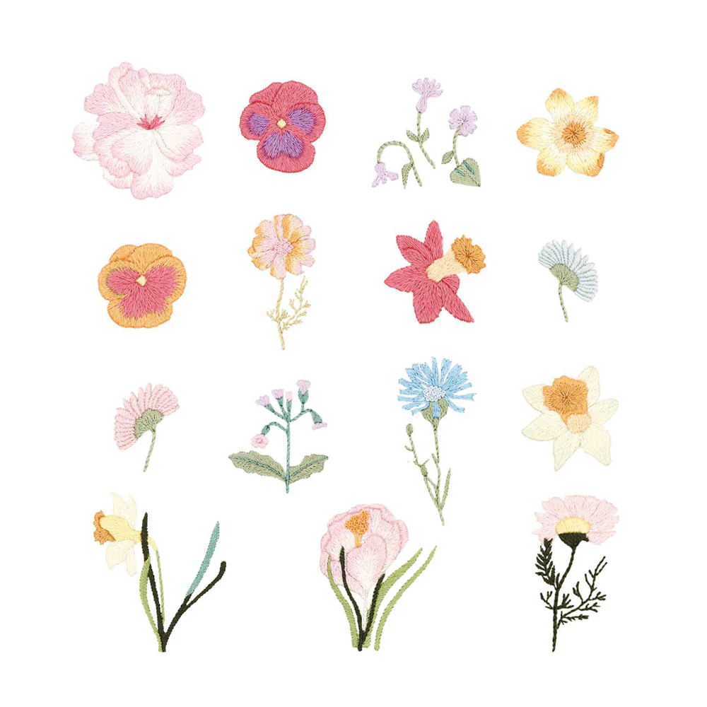 El kit borda y pega hidrosoluble te permite bordar 15 diseños distintos de hermosas flores.
