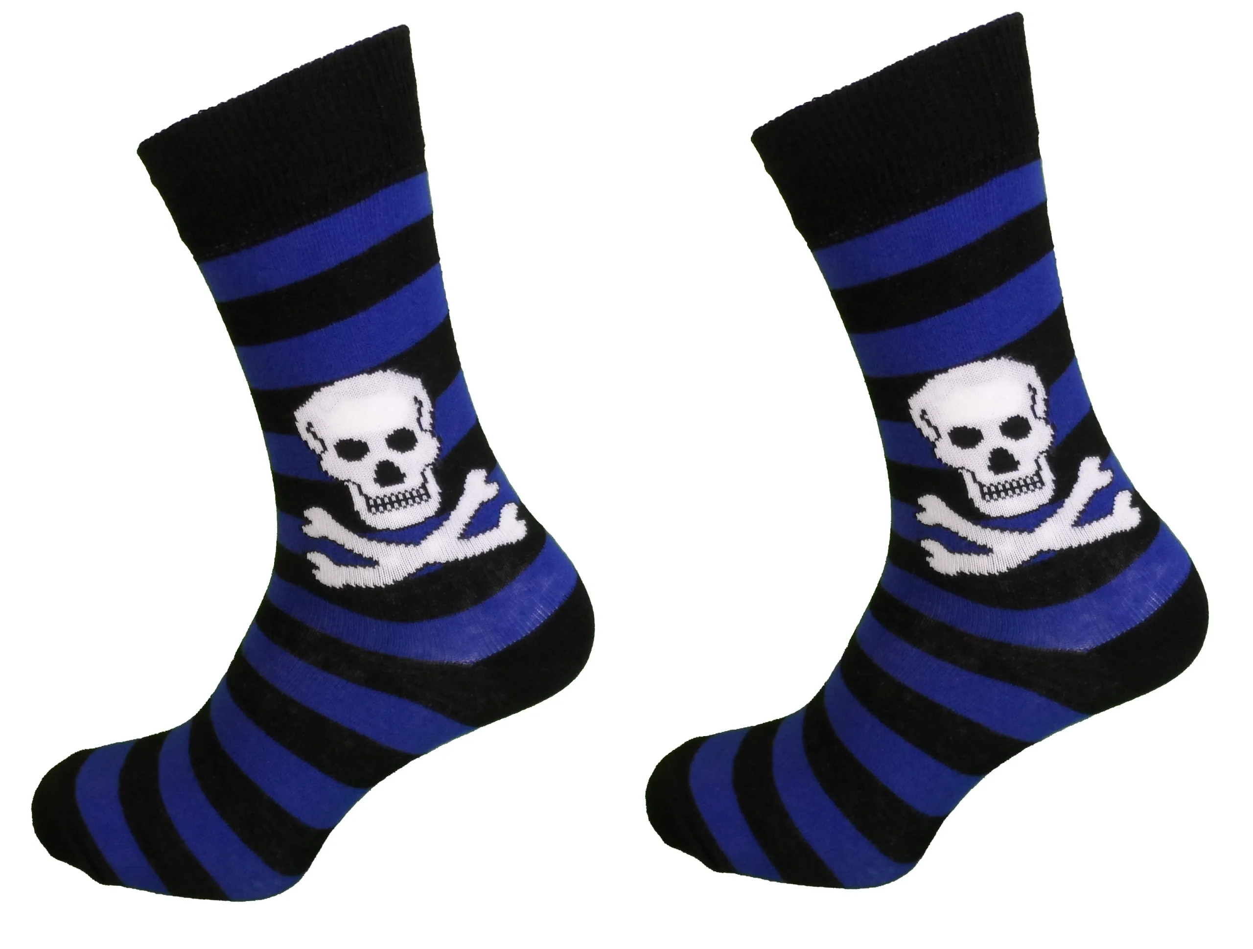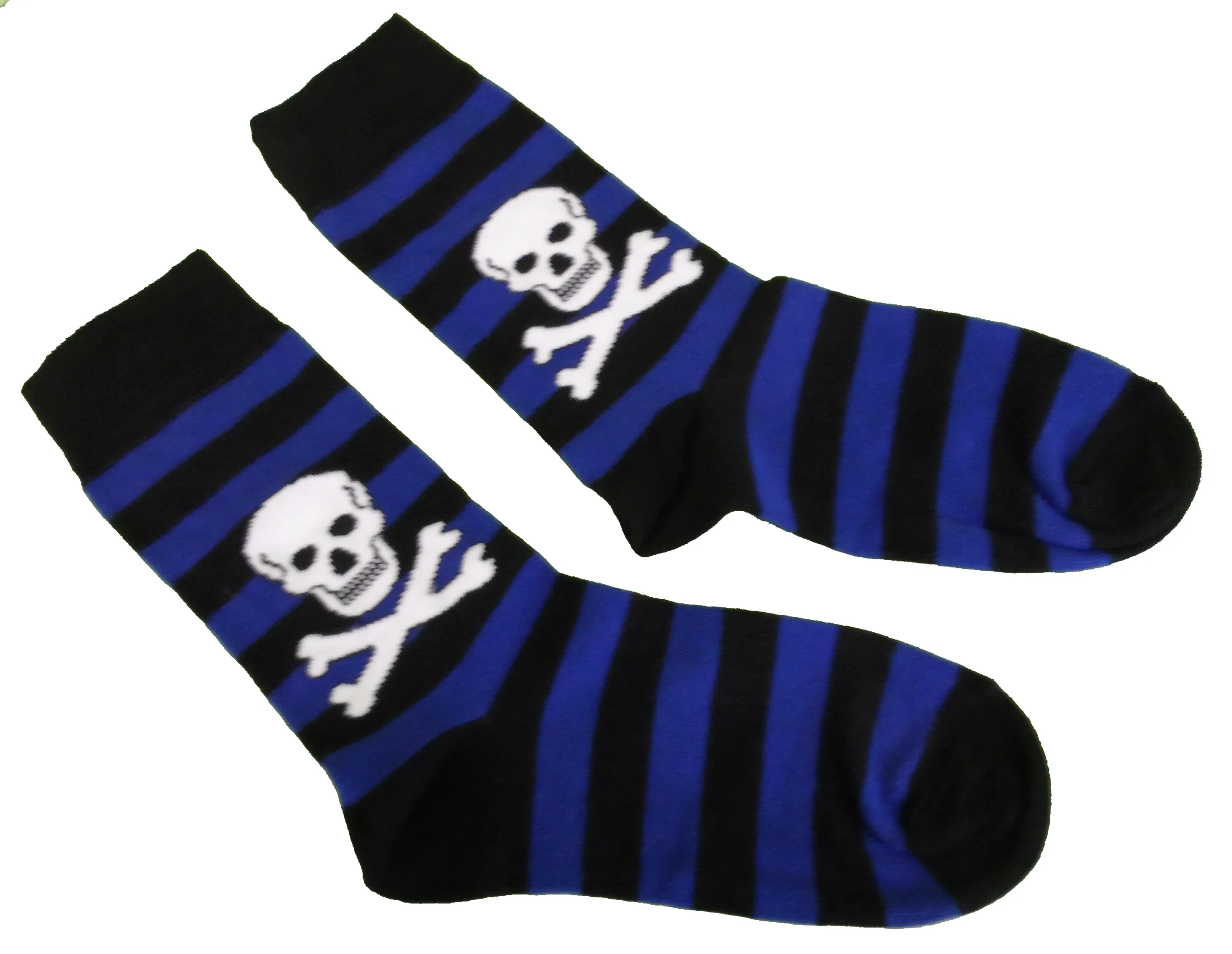 Ladies 2 Pair Blue Striped Skull and Crossbone Socks