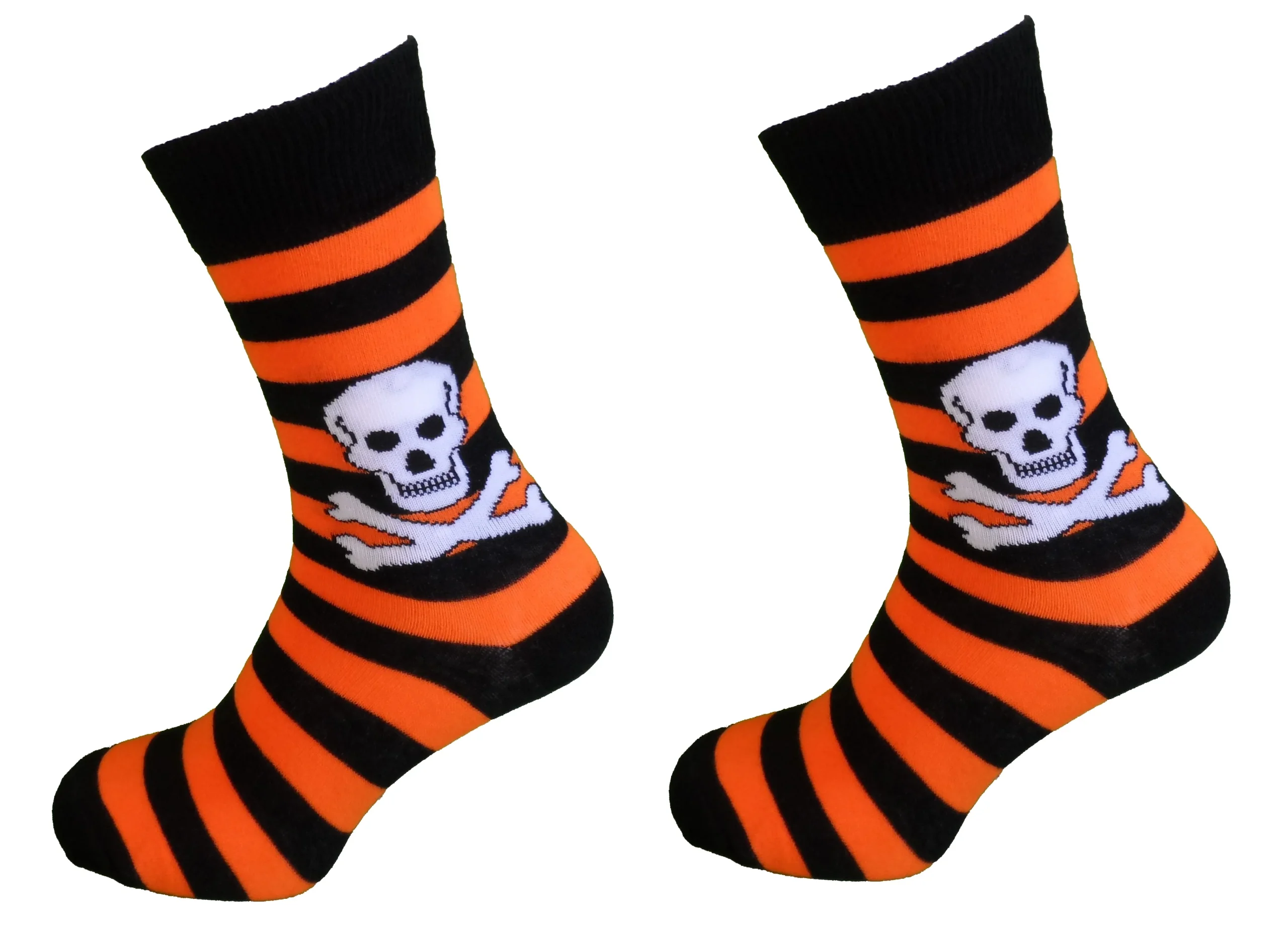 Ladies 2 Pair Orange Striped Skull and Crossbone Socks