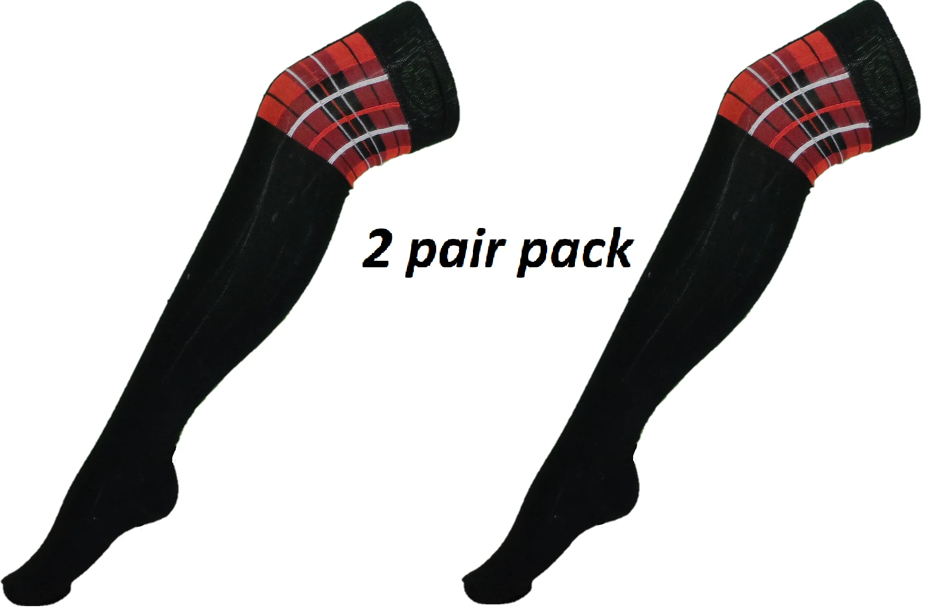 Ladies 2 Pair Pack of Back and Red Tartan Top Over the Knee Socks