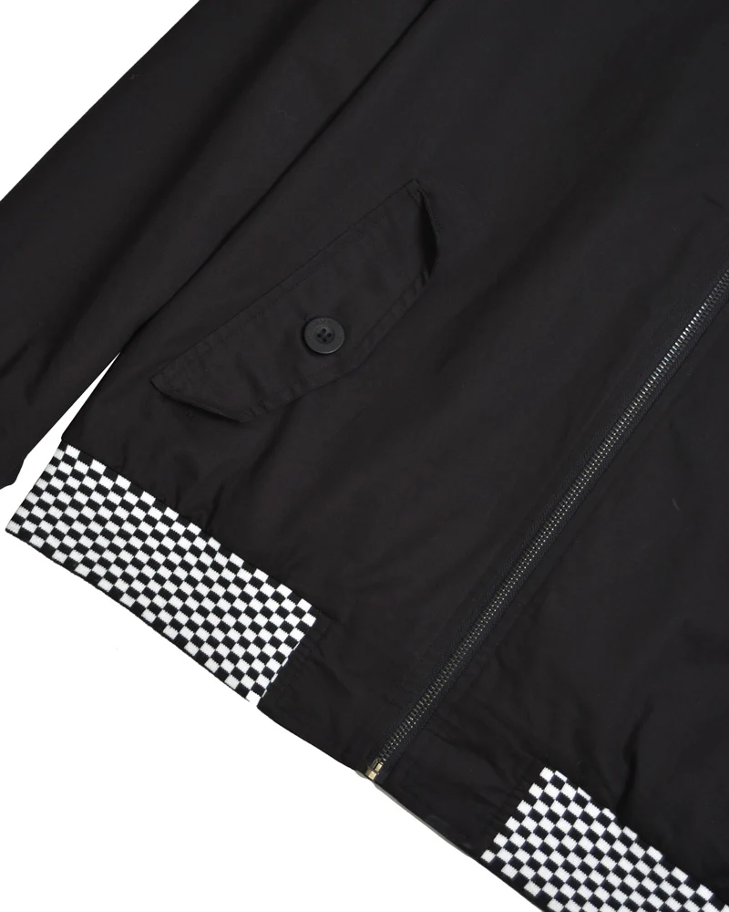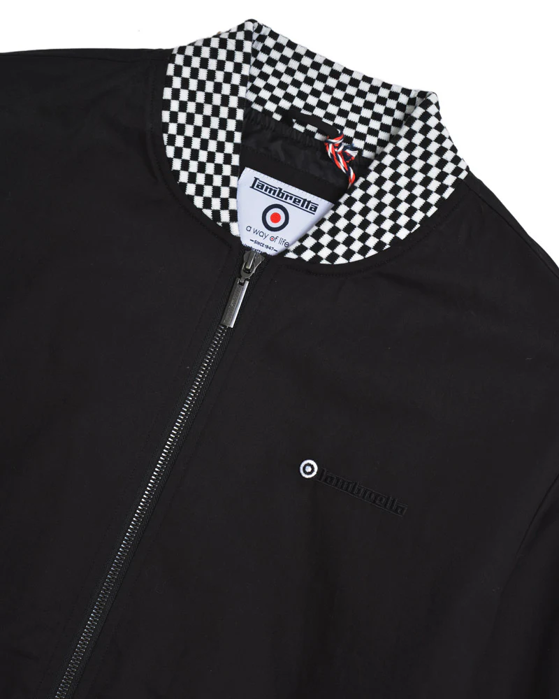 This Lambretta Harrington jacket Black and White check Trim, rolled seam on the zipper to stop any sticking, embroidered chest logo with a target, tonal branded buttons and logo woven label to pocket and inside pocket,