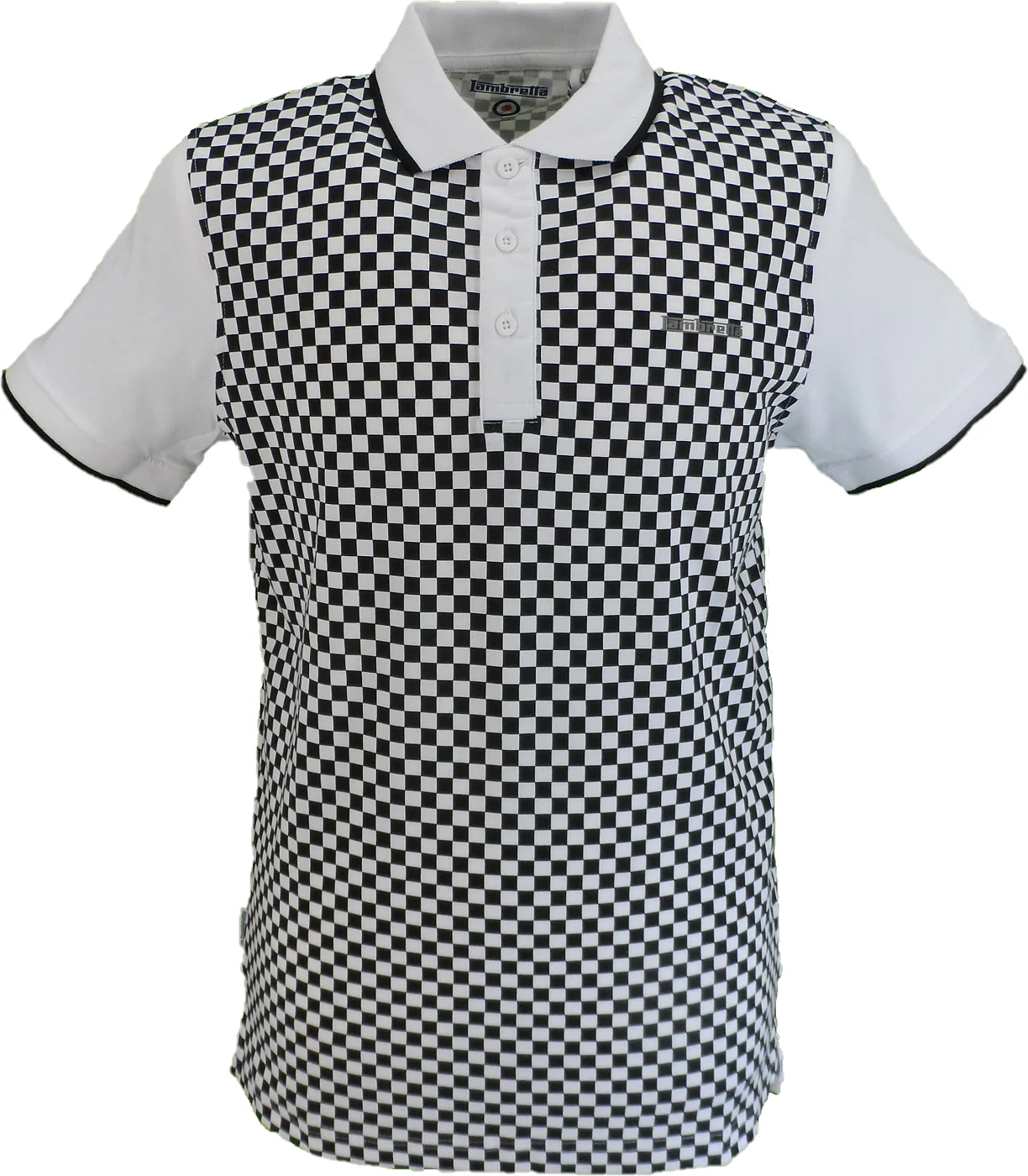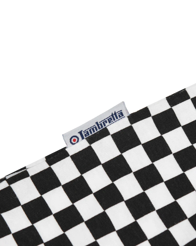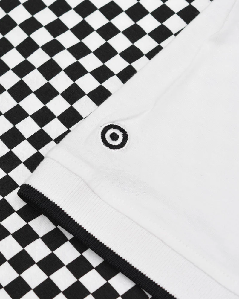 Lambretta Polo Shirt With a Checkerboard Printed Design. The Lambretta logo is Printed on the chest. with white Tipping and a tonal Target on the Sleeve