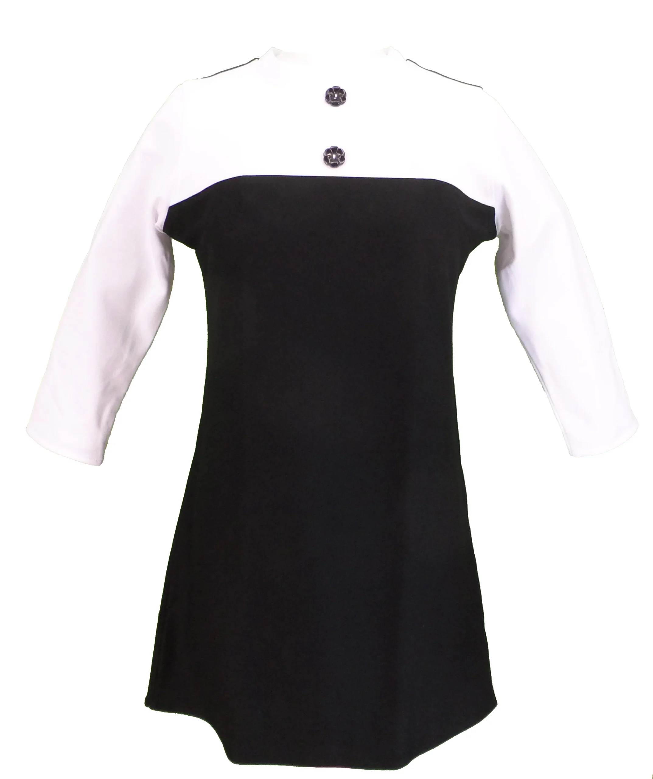Three-quarter sleeve mod dress. Space age chic and monochrome style. The reverse of dress black. Two black buttons on the front. Made from soft Ponte Roma fabric