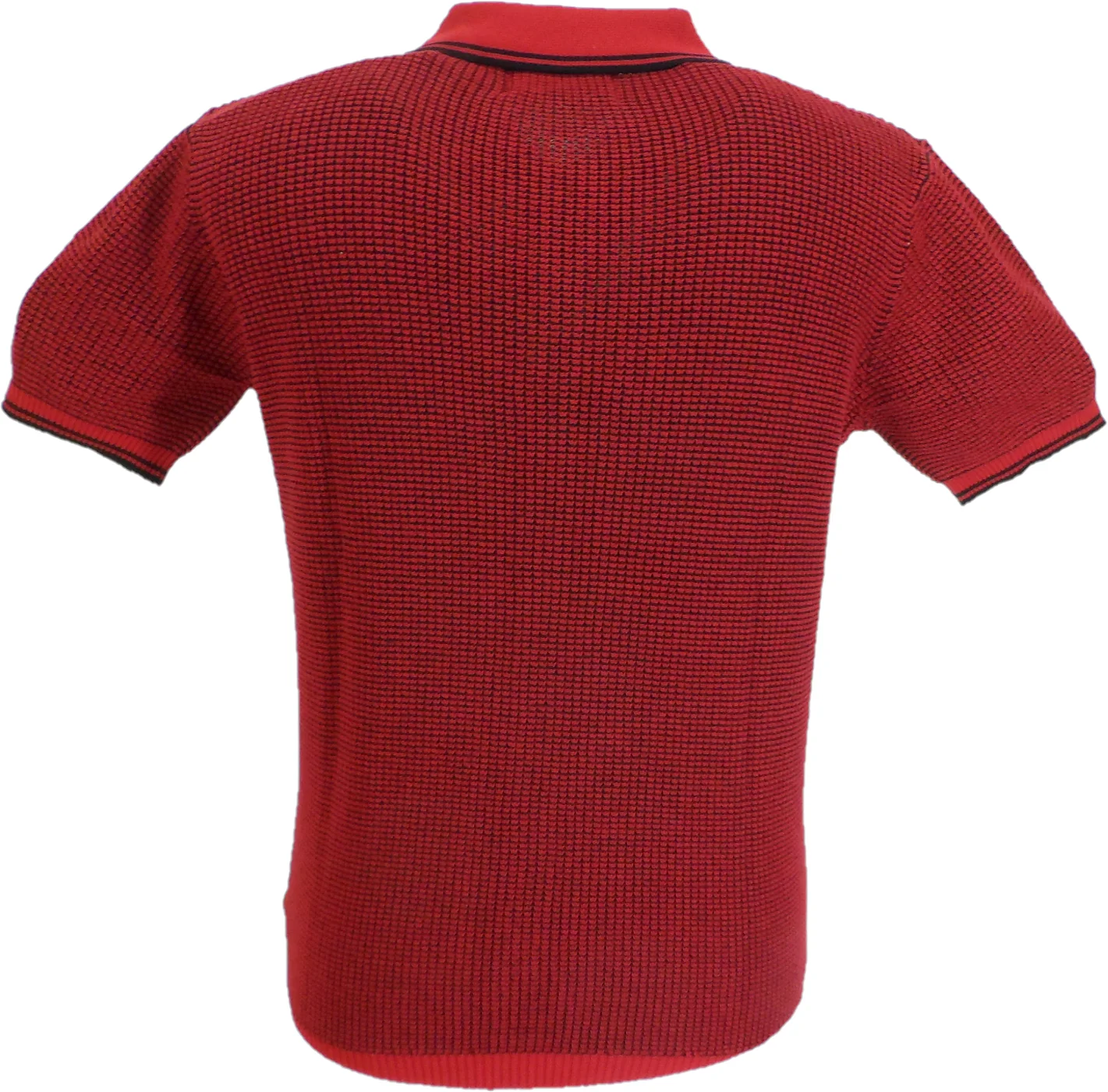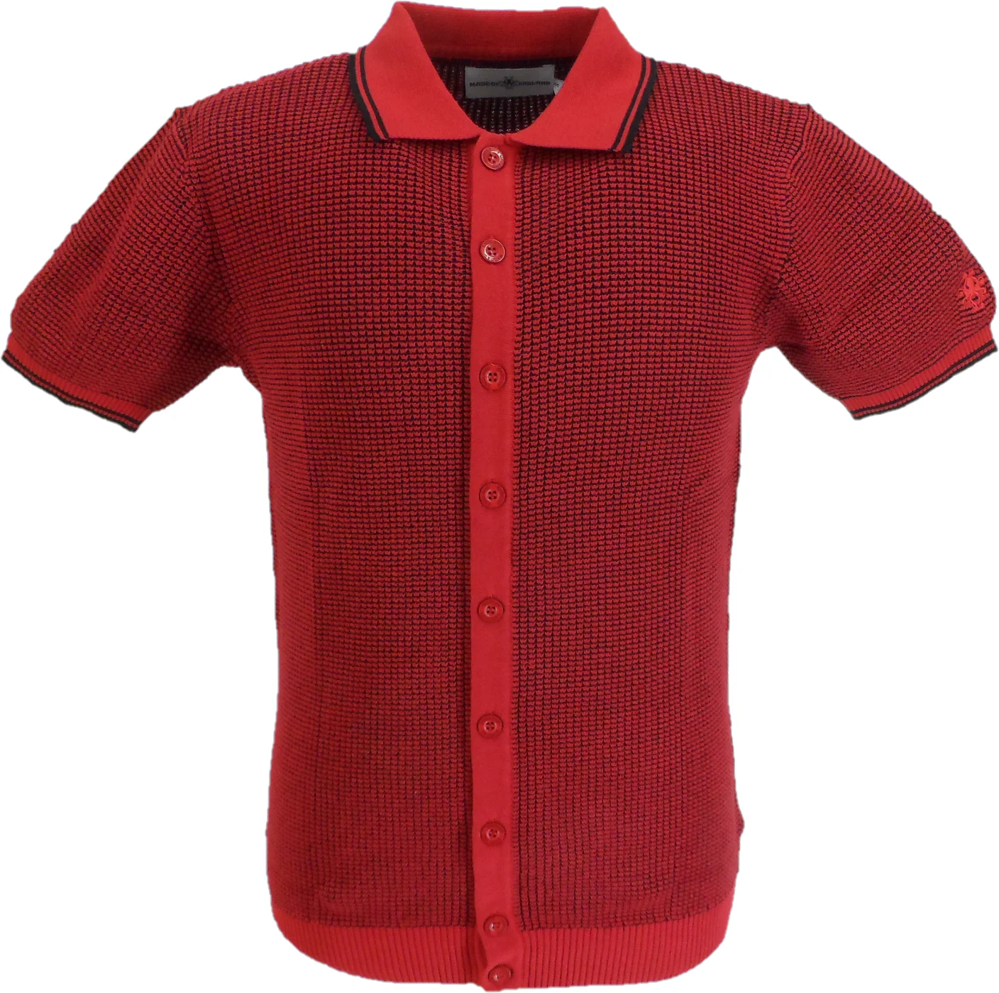 Mens Retro Waffle knitted pattern with Full Button Placket this Madcap Polo has Full button Up fastening and a classic ribbed Tipped collar and Sleeves