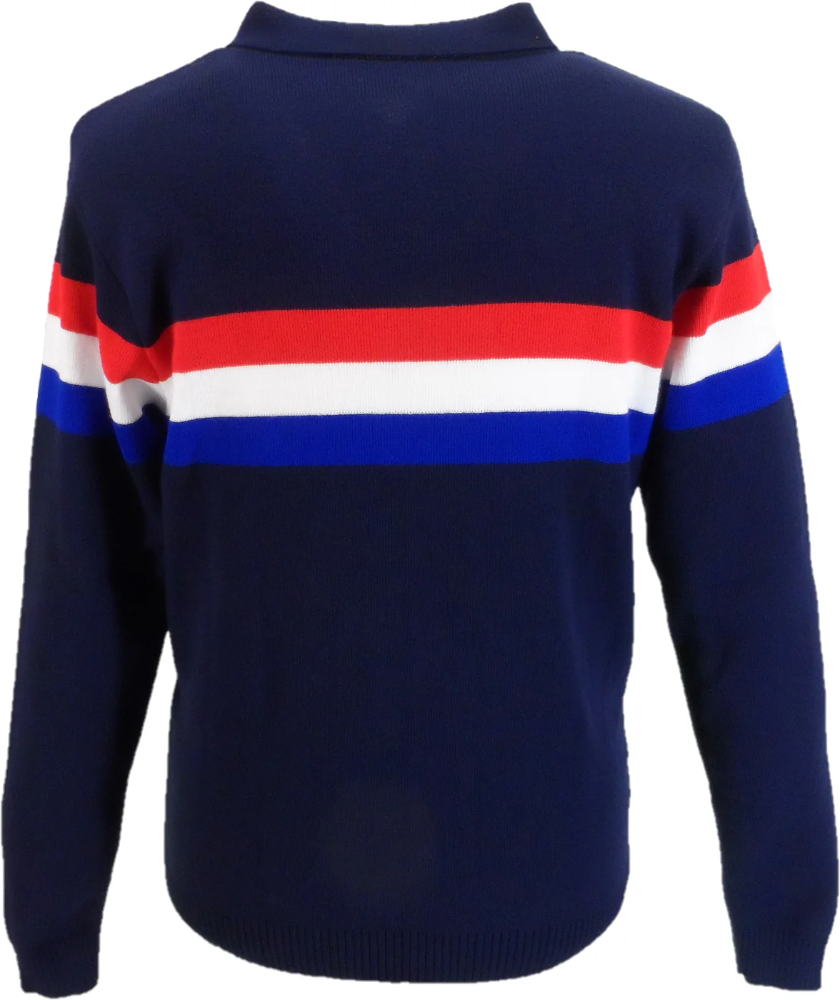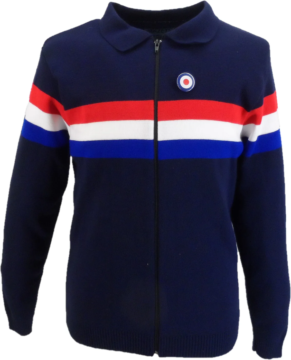 A Pure Classic Britpop polo Inspired by the stripe zip-through fine gauge polo Made in fine gauge with striped front Sleeves and back finished with a full-length zip and a removable Roundel Badge