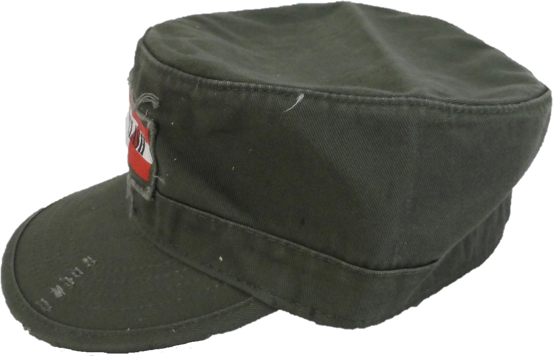 Distressed olive green military cadet cap with front screen print and back embroidered logo.