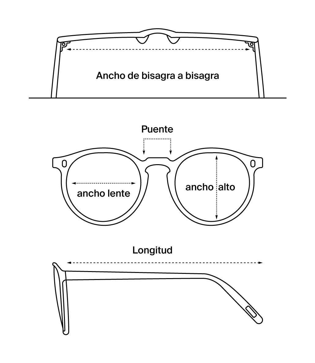 | FIT | ALTURA DE LENTE | ANCHO DE LENTE | ANCHO DE PUENTE | LONGITUD DE PATILLAS | ANCHO DE BISAGRA A BISAGRA |