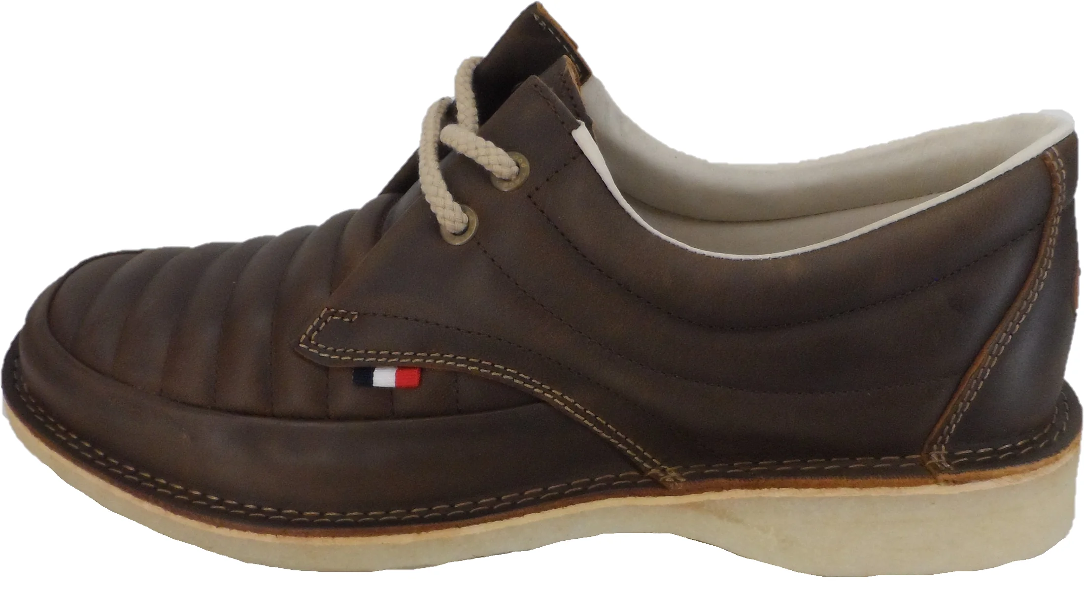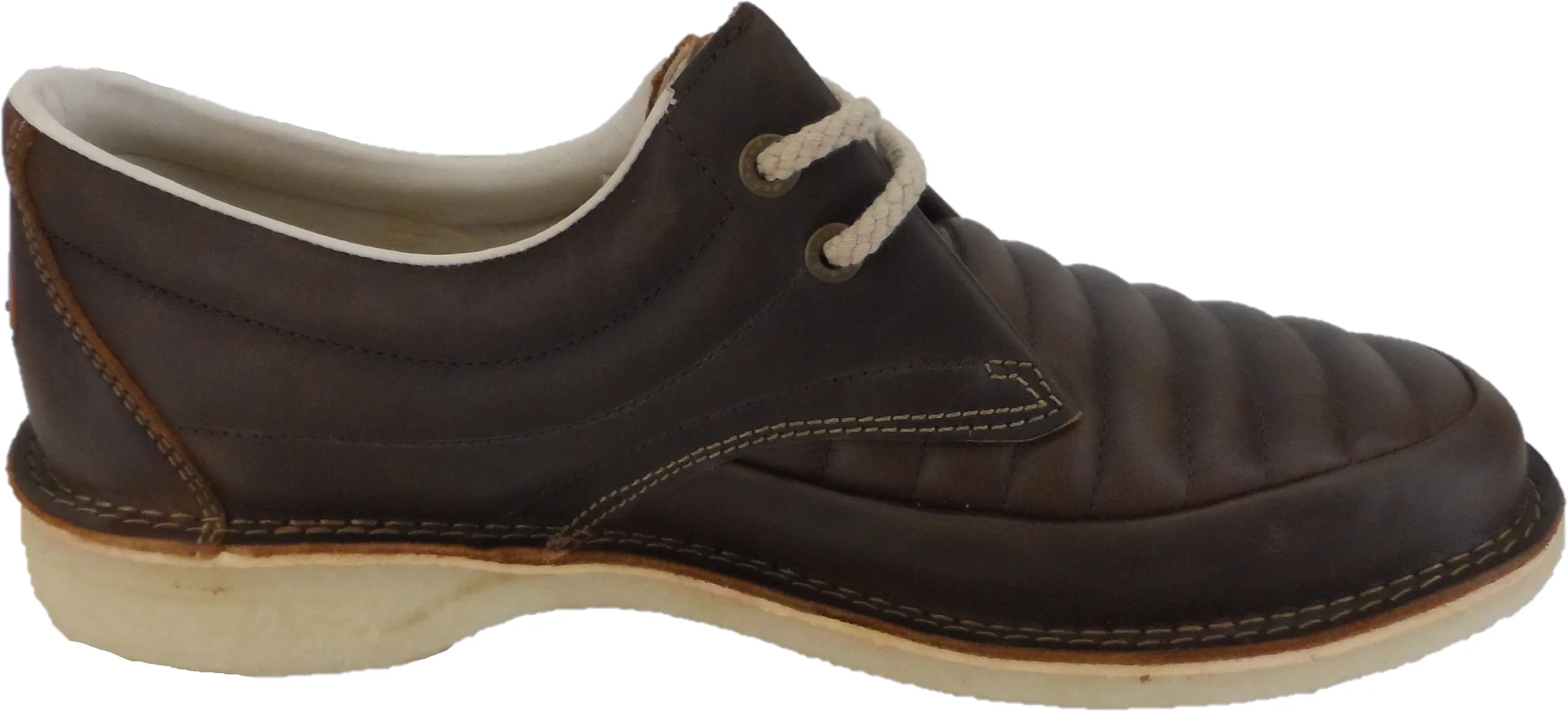 Real leather upper with quilted panel detail. Superb contrast stitch detail throughout, classic Pod Original branded tab detail and branding to heel. Authentic Pod Heritage two-row mudguard stitching, thick crepe sole and round wool lace detail. 2 eyelet fastening. Stunning and stand out mens Retro Mod footwear with an undoubted Indie edge.ace detail.