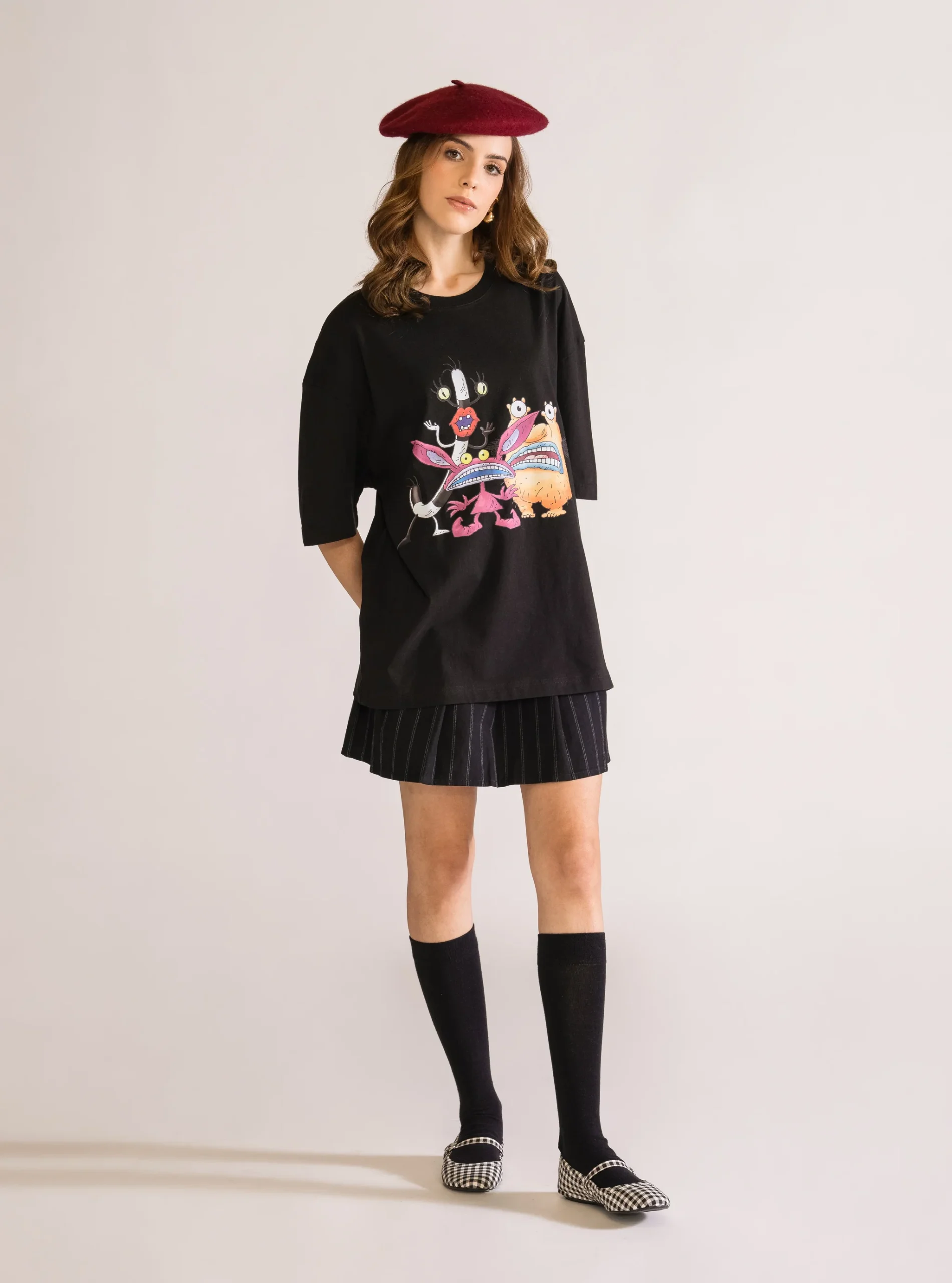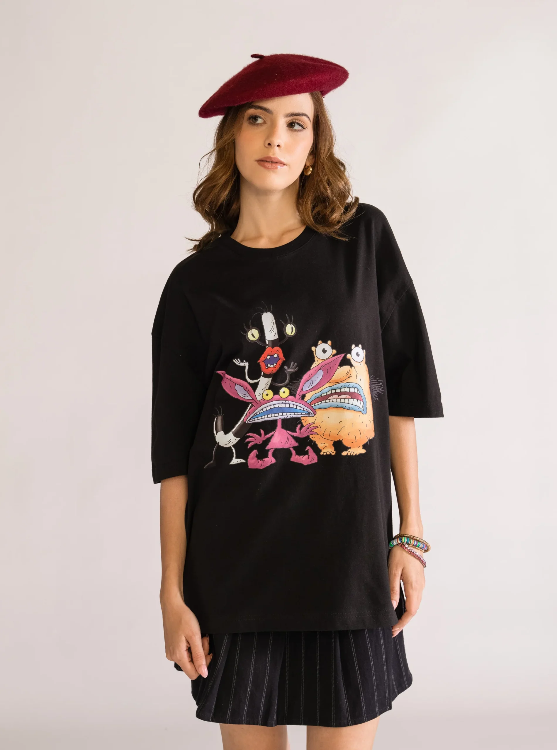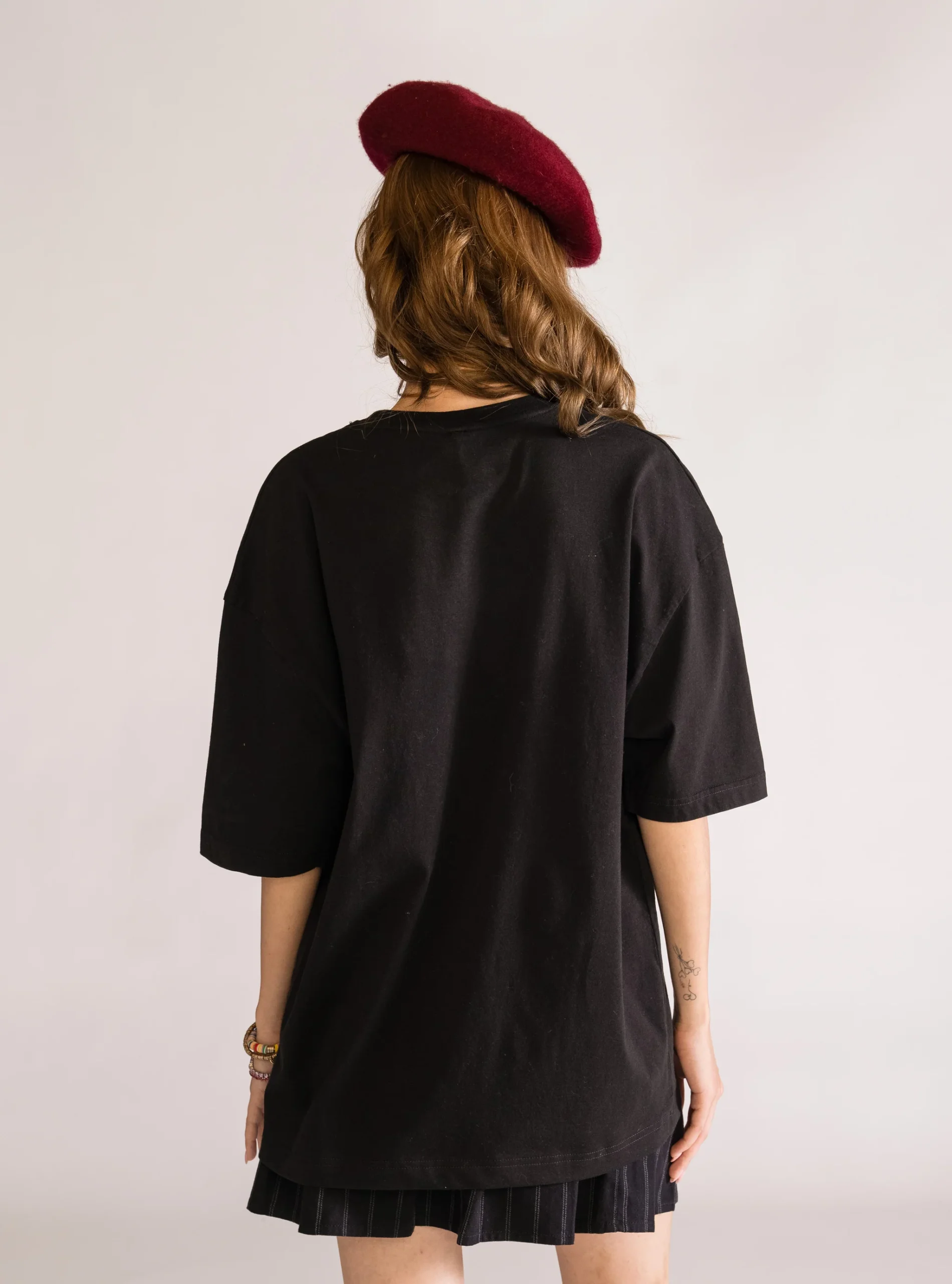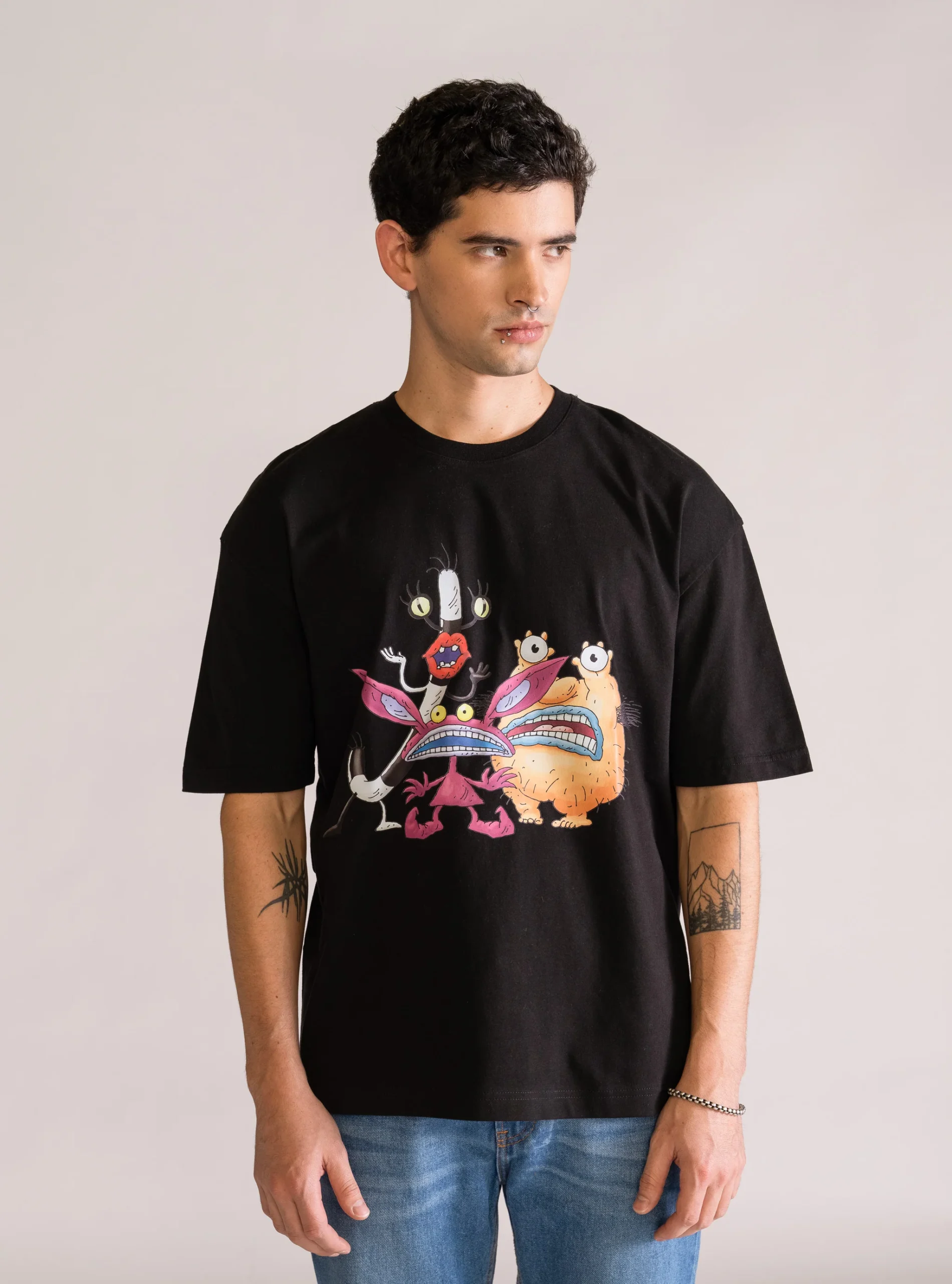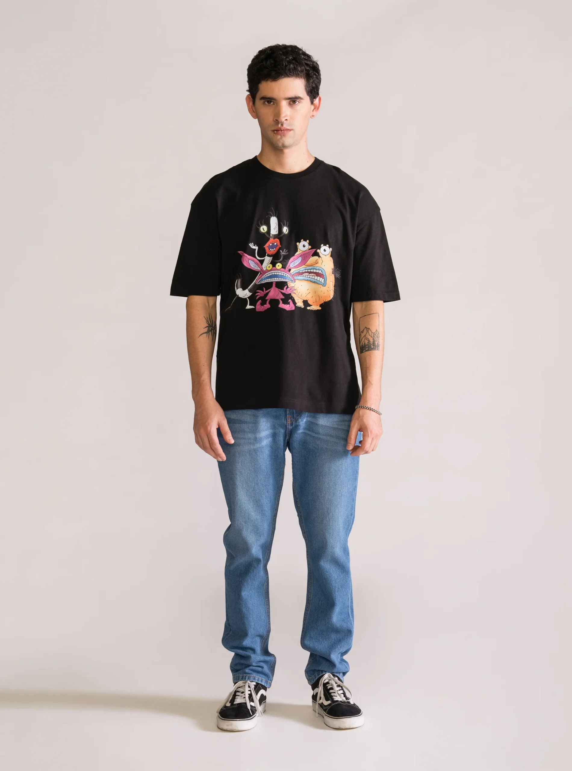 Playera negra corte drop shoulder, hecha de 100% algod贸n, con ilustraci贸n impresa en DTF para un acabado definido y duradero.