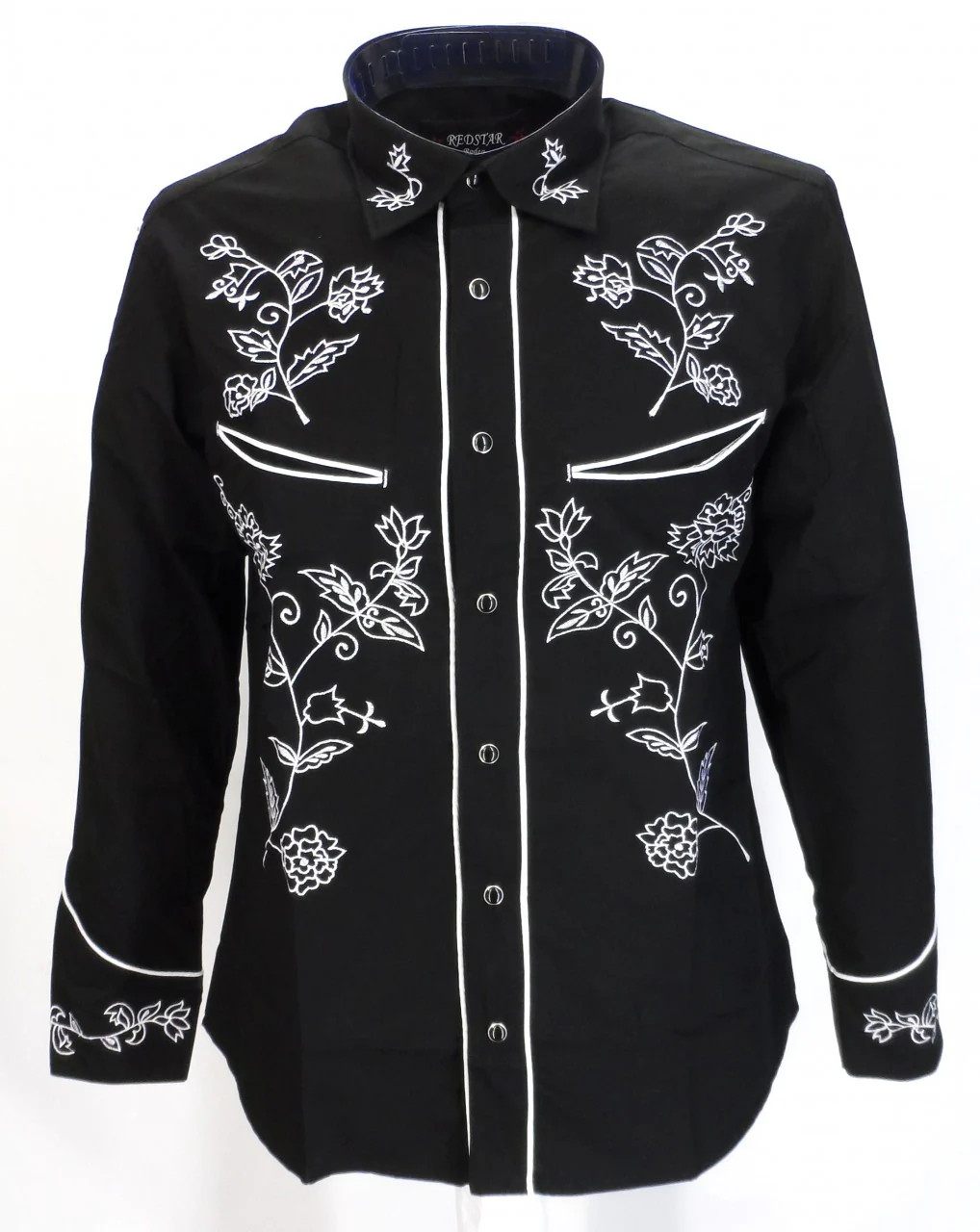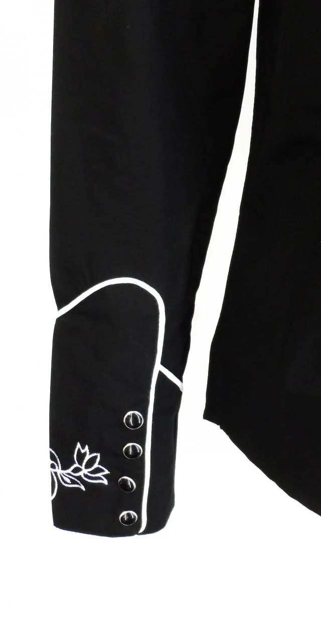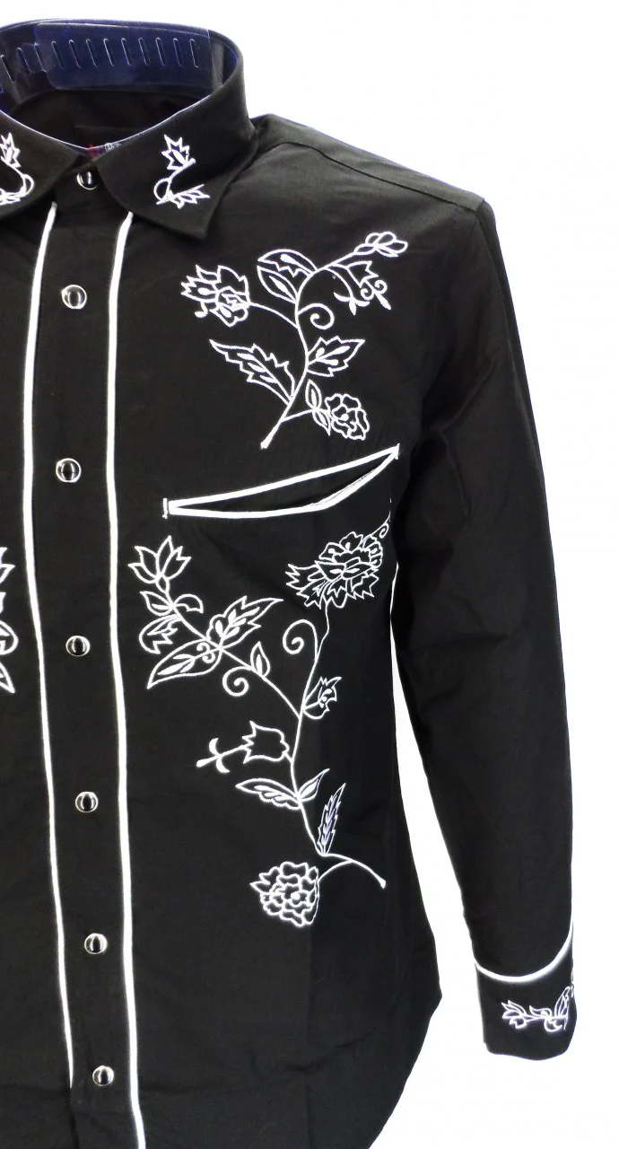 Classic cowboy shirts made of Polycotton with popper fastening at the front 4 popper cuff fastening and 2 slanted breast pockets, front back and collar embroidery finished with white piping