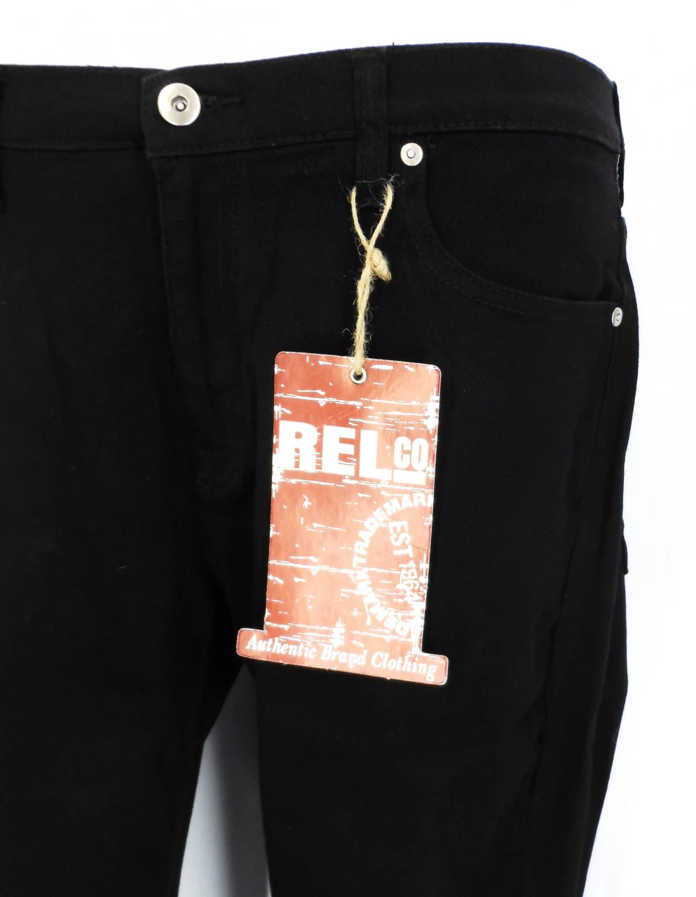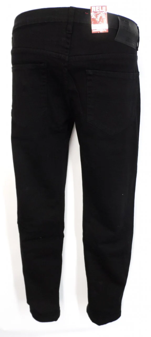 Metal button and YKK fly zip, 5 pockets detail on front, skinny fit with a 31.5-inch leg back Relco brand patch.