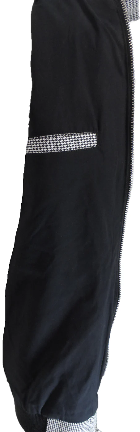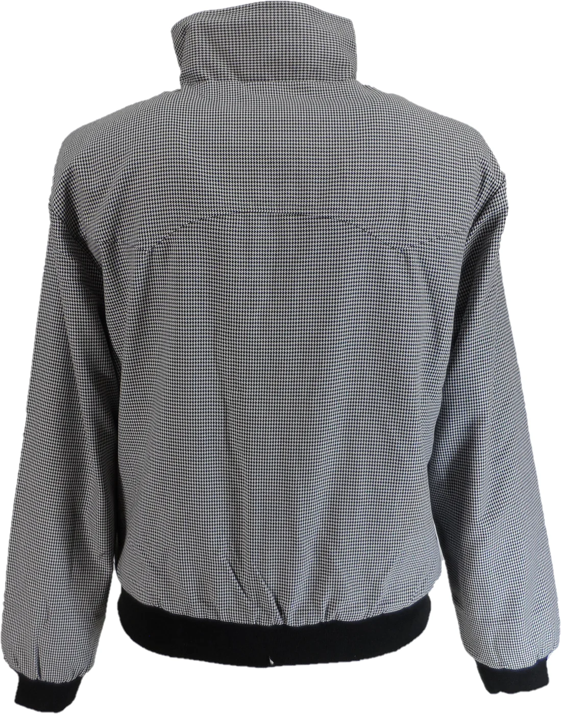 The Relco Classic Harrington jacket features a distinctive Dogtooth Check design, complete with a durable metal zipper, elasticated cuffs, a buttoned flap pocket, and a stylish wavy seam across the back shoulder for a unique finish.