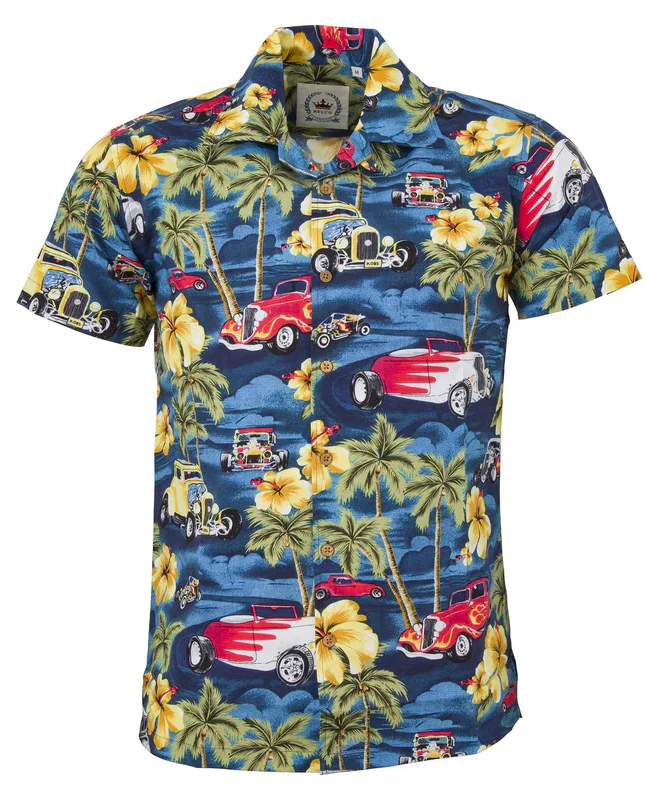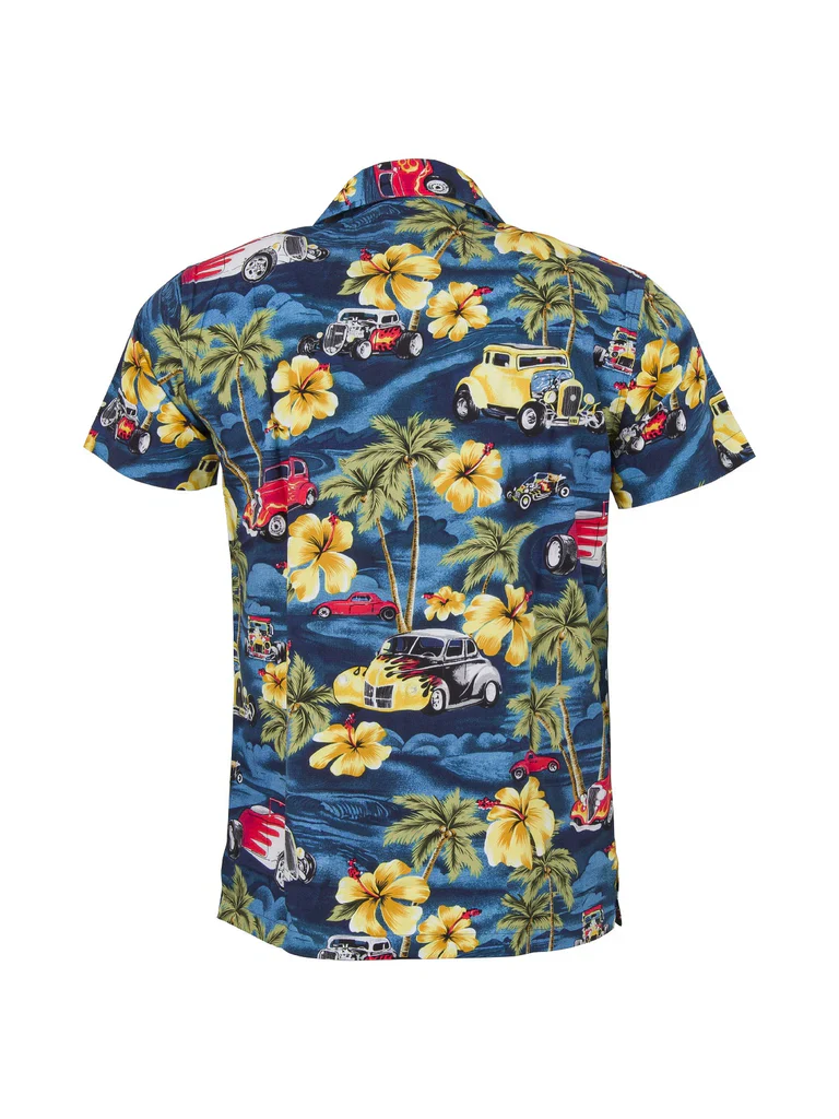 Relco Mens Retro Car Print Hawaiian Bowling Shirt