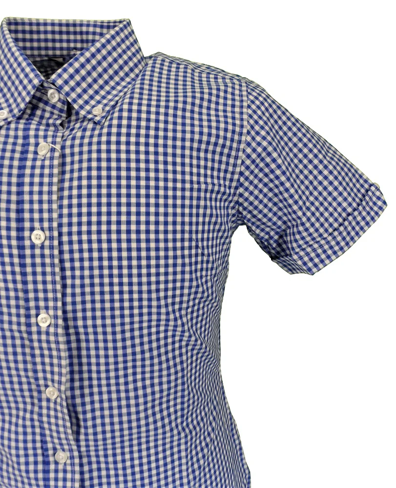 Relco Retro Blue Gingham Ladies Button Down Short Sleeved Shirts