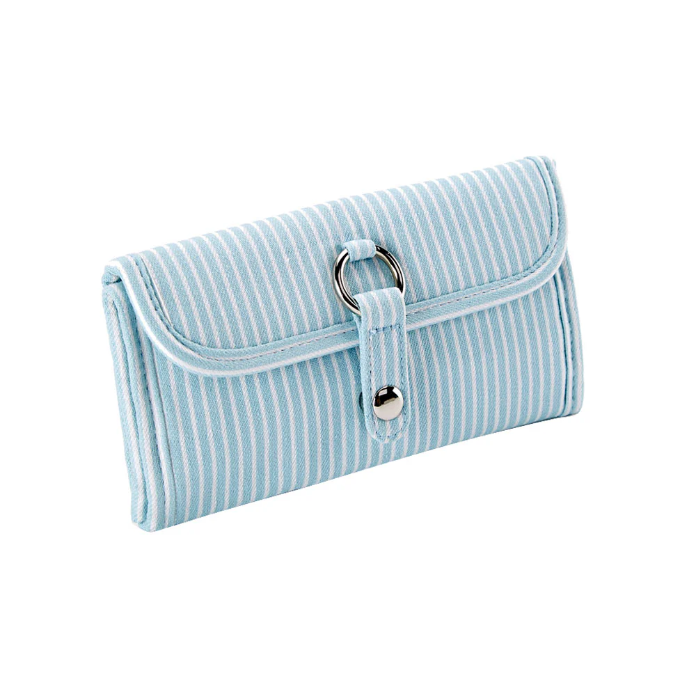 Este práctico set viene con un estuche celeste con rayas blancas para guardarlos y llevarlos a donde quieras