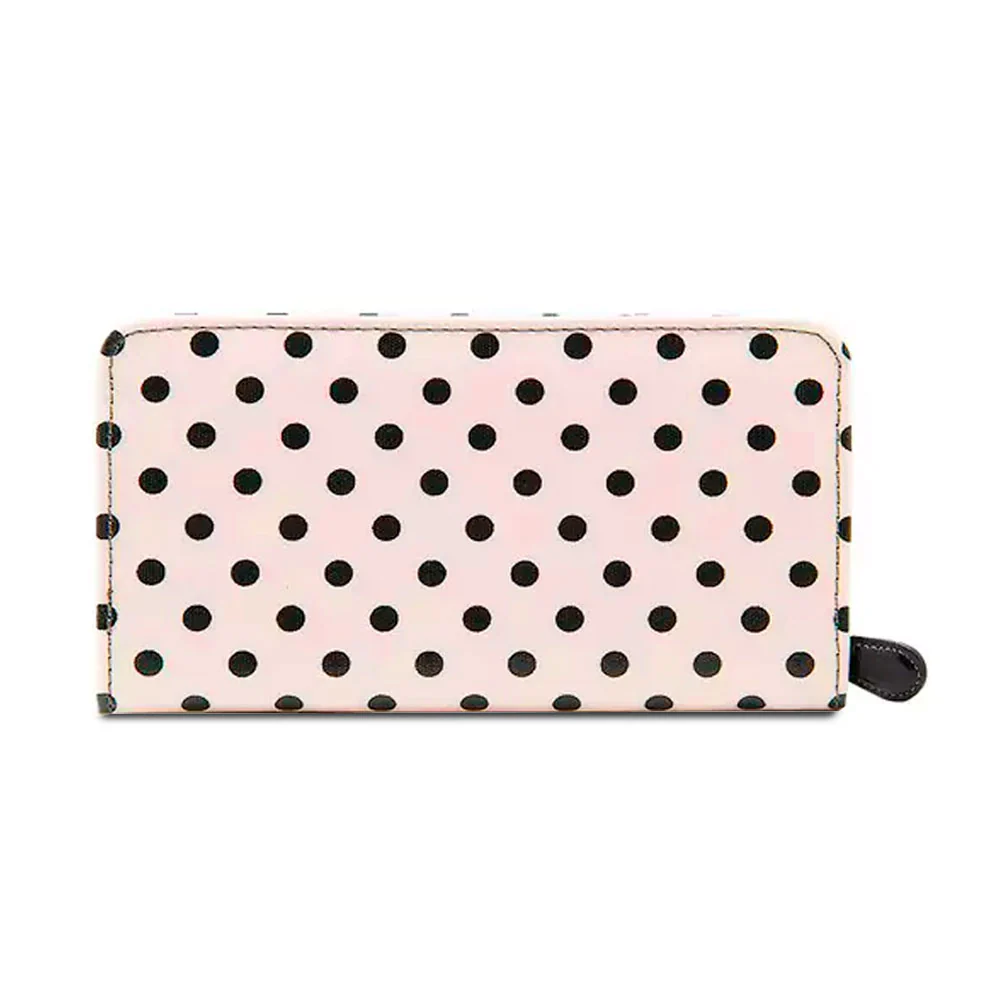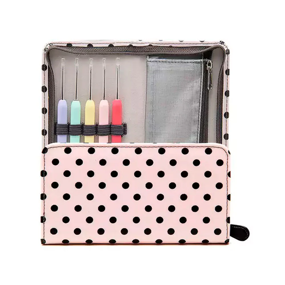 Este práctico set viene con un estuche rosado con puntos negros para guardarlos y llevarlos a donde quieras