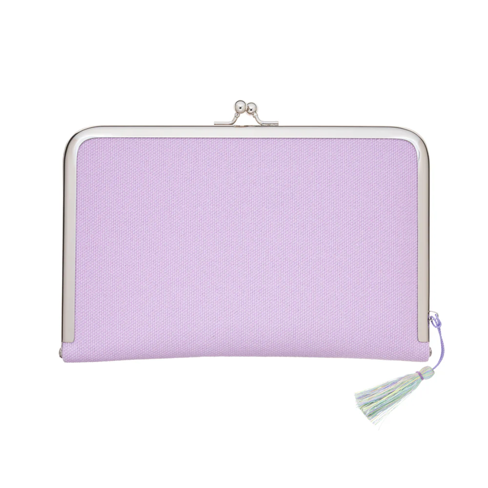 - Estuche tipo gamaguchi hecho a mano en Japón, con cierre metálico tradicional y diseño textil en tonos pastel murasaki.