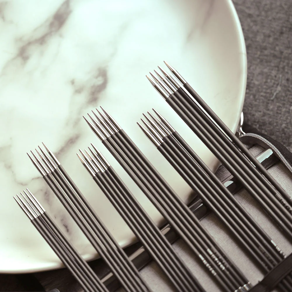 Set de 25 palillos de doble punta Karbonz empaquetados en un atractivo estuche de tela negra y gris, con vinilo transparente. Son 5 palillos de cada medida para que puedas tejer en circular todos los proyectos que tengas en mente.