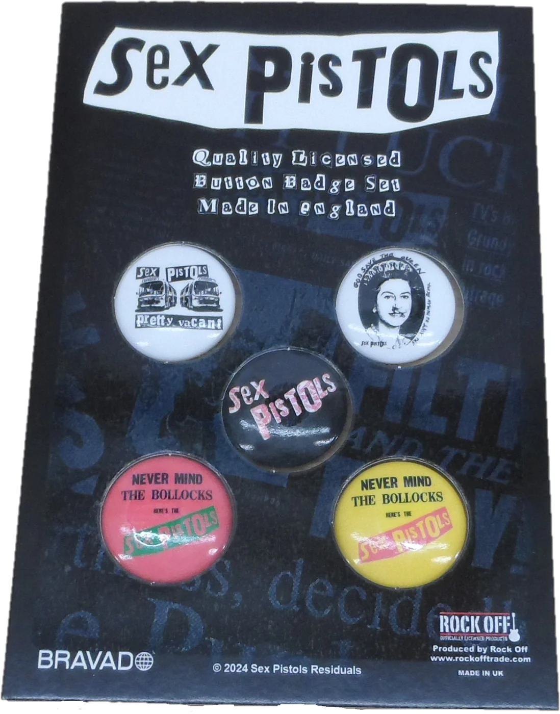 Set of 5 digitally printed plastic button badges in a poly bag with a hang tag. The badges are made from plastic & are fitted with a traditional metal safety pin fastening.