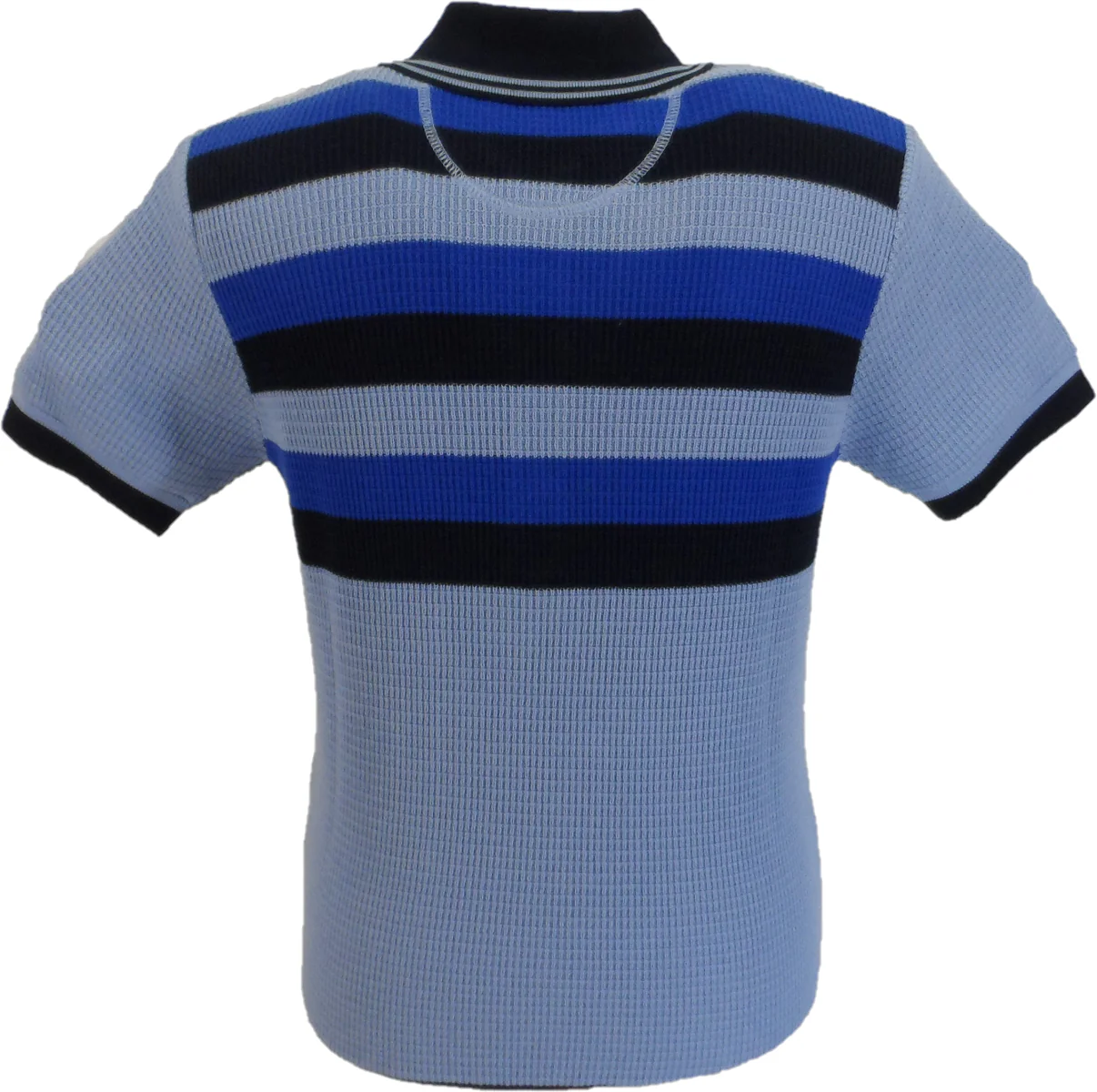 Cotton fine gauge waffle knit border stripe, with four large logo IMOP button placket, with hidden button/loop, twin tipping to collar, with contrast collar, cuffs and hem. Crafted from 100% Cotton.