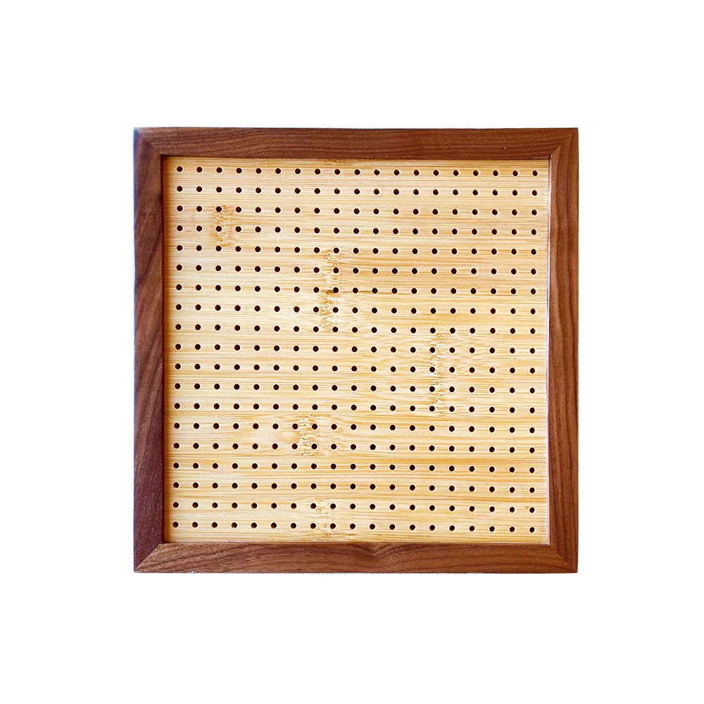 Una Tabla Bloqueadora fabricada de bambú y nogal negro del alta densidad, lo que aumenta su resistencia a los cambios de temperatura y grado de humedad. Las varillas son de metal, por lo que podrá soportar altas tensiones. El área de bloqueo mide 27 x 27 cm aproximadamente y cuenta con 1 cm de separación entre orificios. Podrás bloquear tus grannys cuadrados a la medida justa!