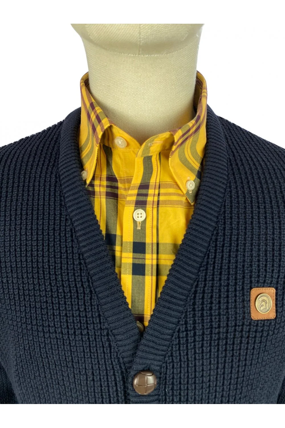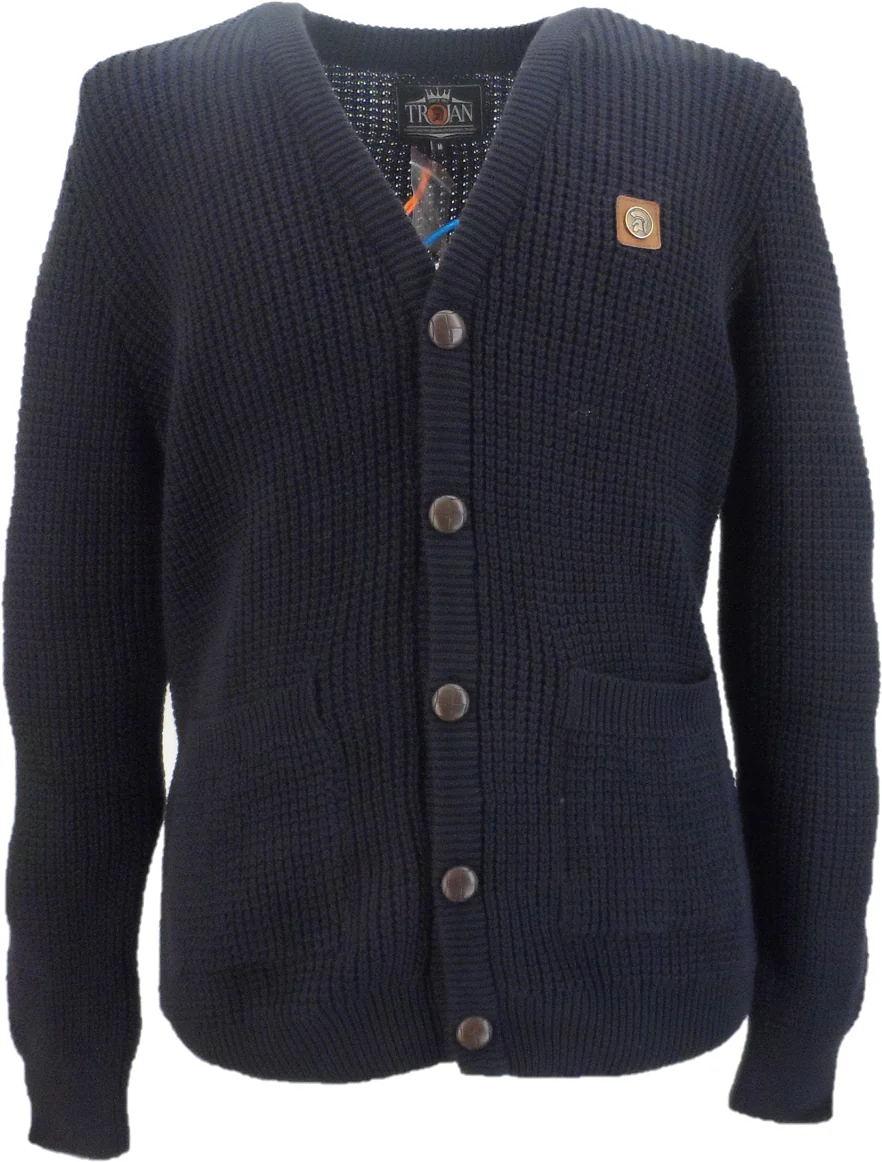 This Navy cardigan features a 100% cotton waffle knit design, accented with two convenient patch pockets, classic football buttons, and a distinctive Trojan metal badge. Perfect for adding timeless style and comfort to your wardrobe.