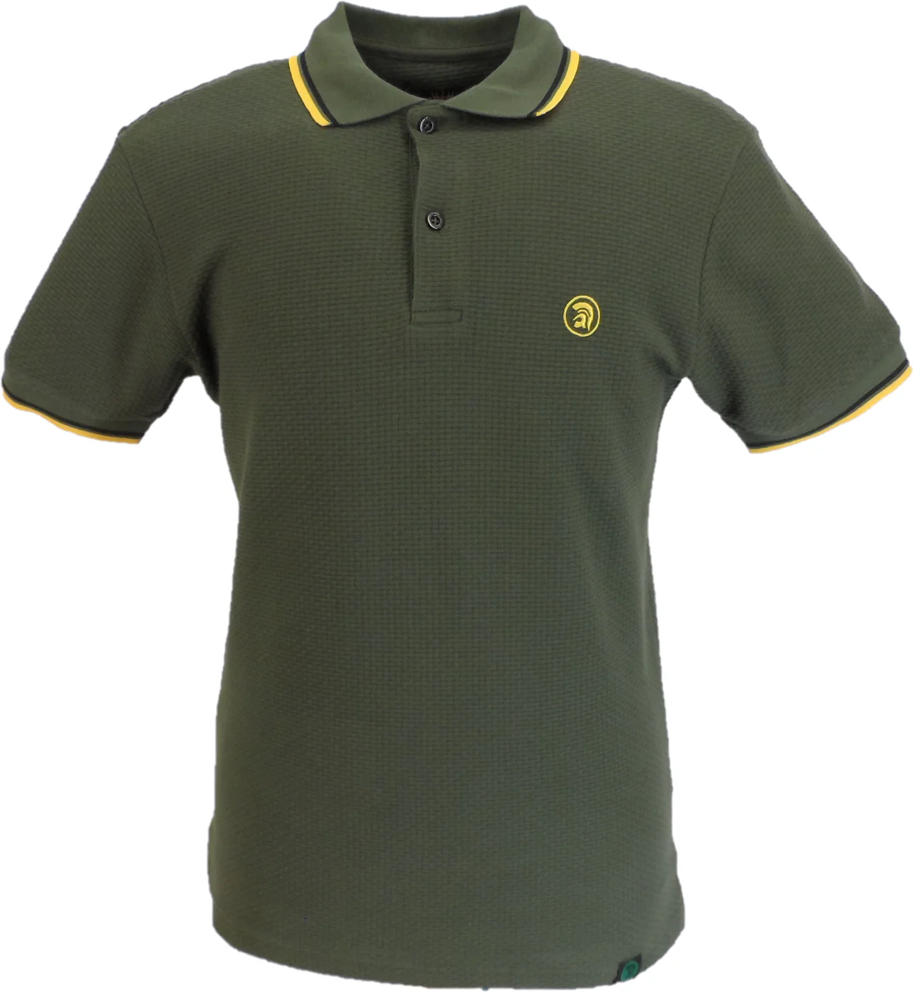 Cotton extured polo (basket weave), with poly twin-tipping to collar and cuffs, with Trojan helmet embroidery on chest and woven Trojan label at hem.