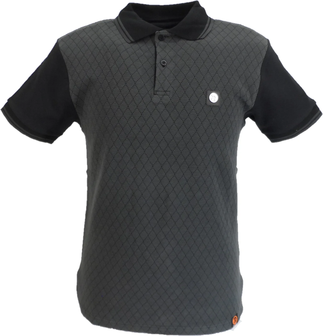 Heavy Cotton interlock polo, with Ottoman rib diamond jacquard front panel, with twin-tipping detail to collar and cuffs, with Trojan metal badge to chest and woven Trojan label at hem.