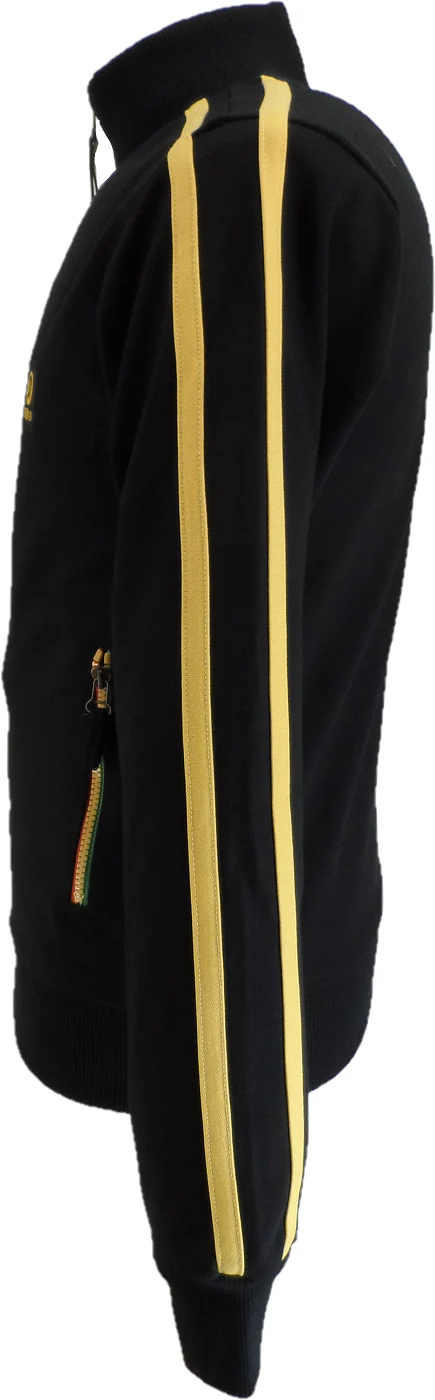 Retro knit track top, with contrast three colour zip front and zip pockets, with laid-on twin-stripe detail to shoulder/sleeve, with rib collar, cuffs, and hem, with Trojan embossed zip-puller, and Trojan Logo badge to chest and woven label at hem.