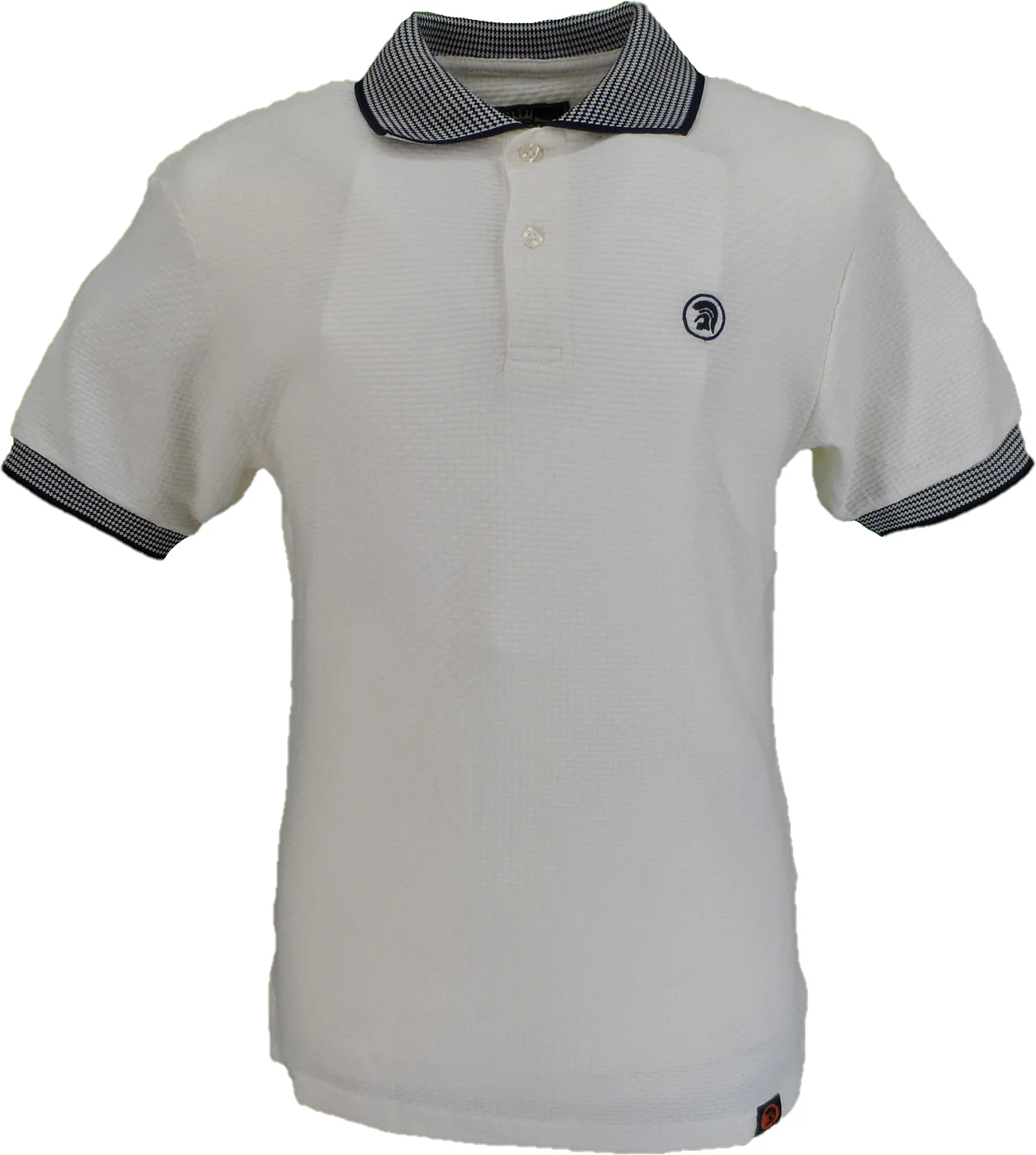 Basket Weave Cotton pique polo, with jacquard check collar and cuffs, with Trojan helmet embroidery on chest and woven Trojan label at hem.