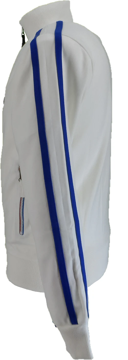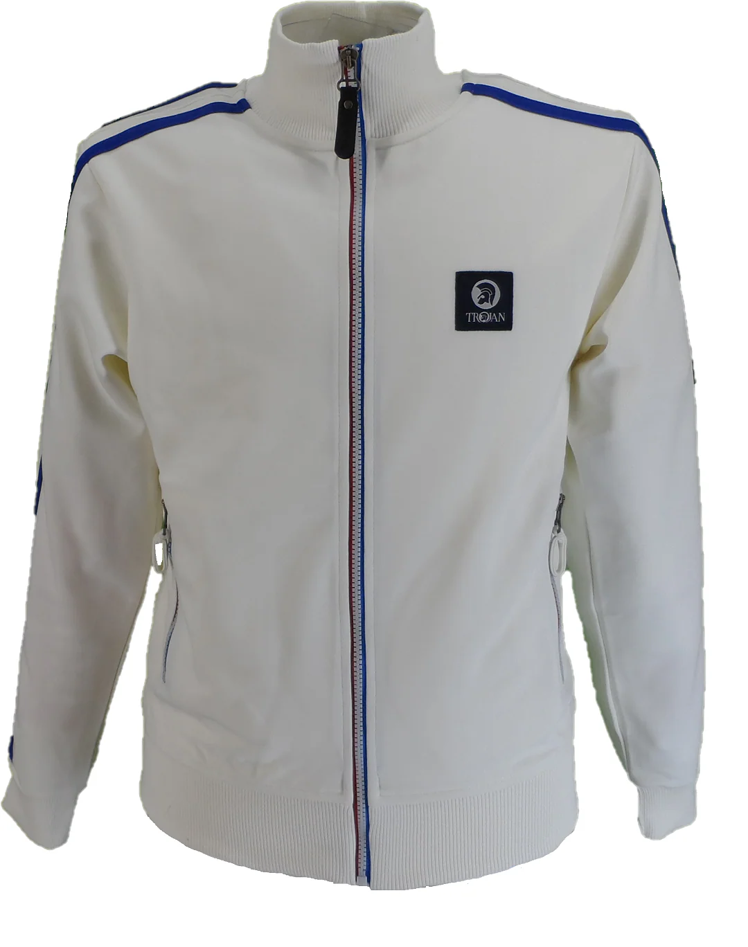 Retro knit track top, with contrast three colour zip front and zip pockets, with laid-on twin-stripe detail to shoulder/sleeve, with rib collar, cuffs, and hem, with Trojan embossed zip-puller, metal badge to chest and woven label at hem.