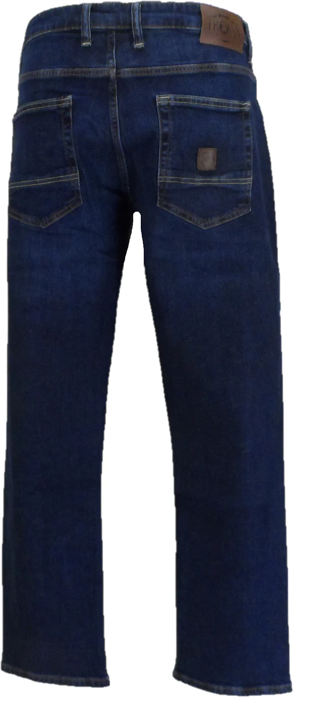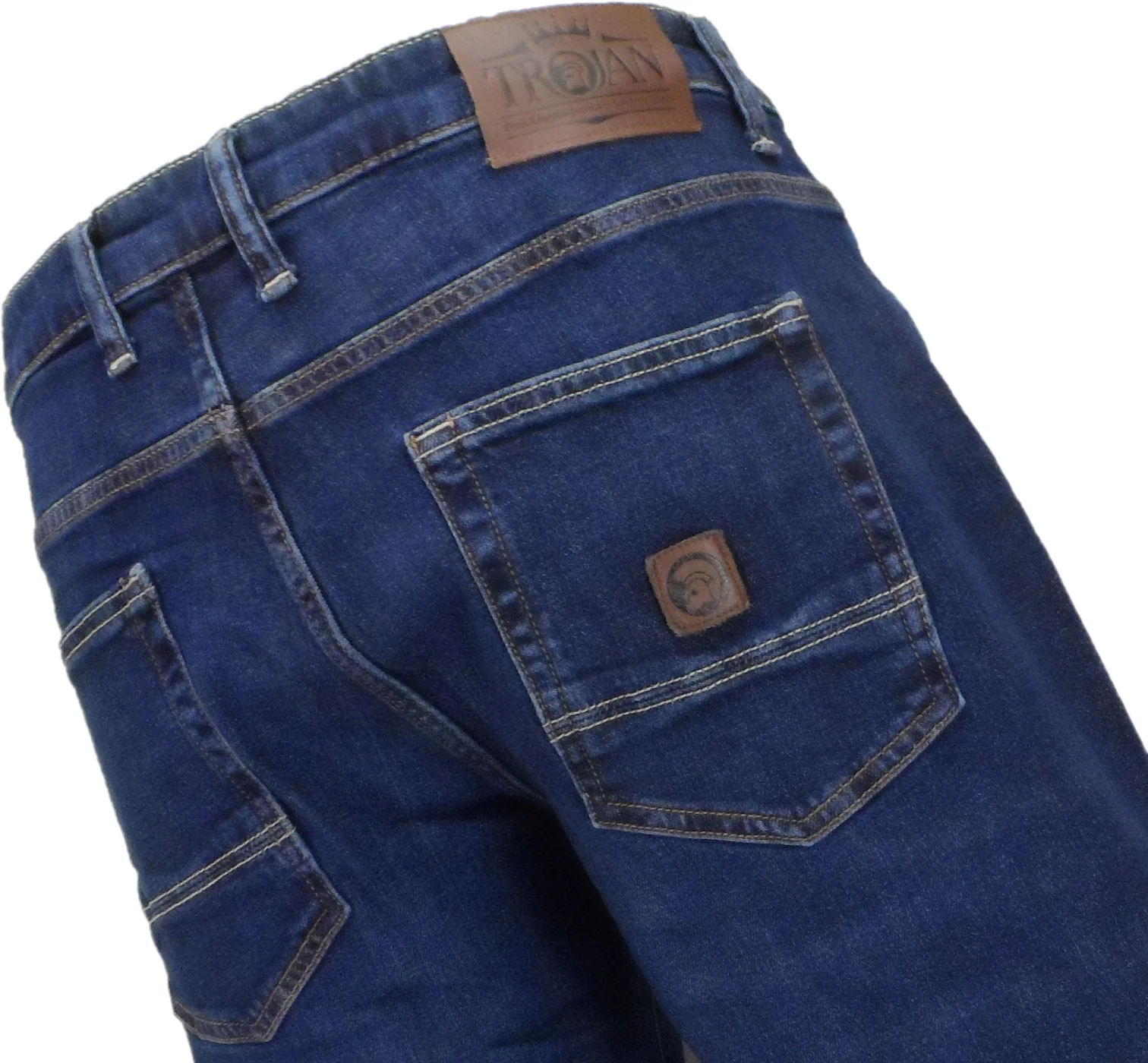 Experience the comfort and durability of Trojan Mens Zip fly jeans crafted from stretch denim. Featuring a classic straight leg design with a 14.5″ hem on a 32W size, these 5-pocket jeans include a convenient coin pocket. Detailed with yellow and gold two-tone stitching, including stylish hem turn-up accents, they also showcase front pockets with branded Trojan rivets and a matching top button. Finished with a leather Trojan patch on the waistband and an embossed leather badge on the pocket, these jeans offer timeless style and reliable quality.