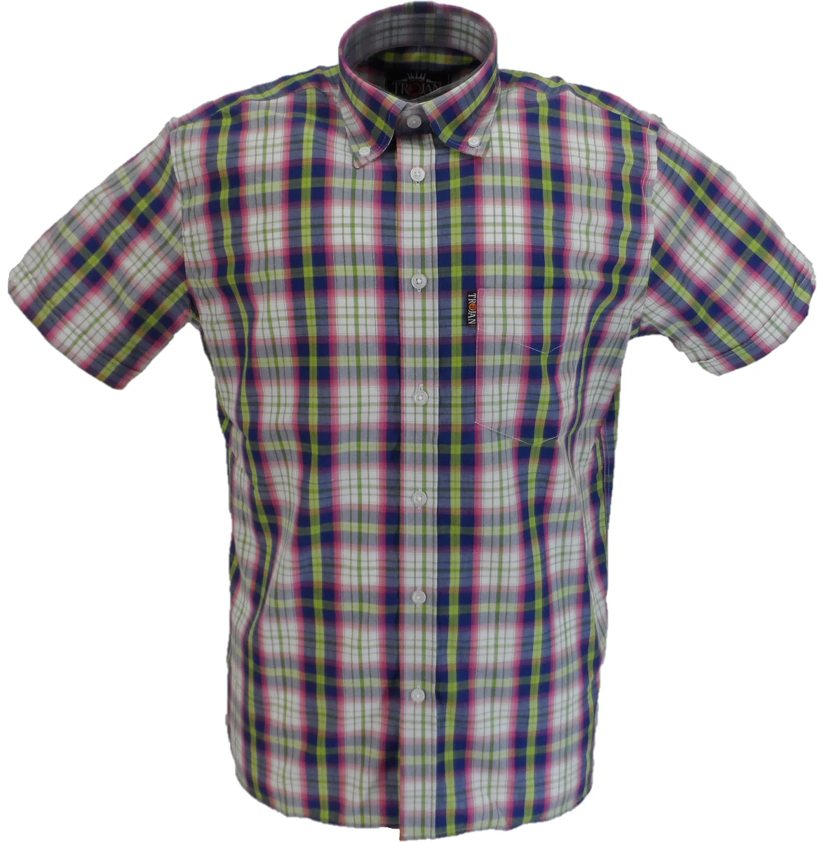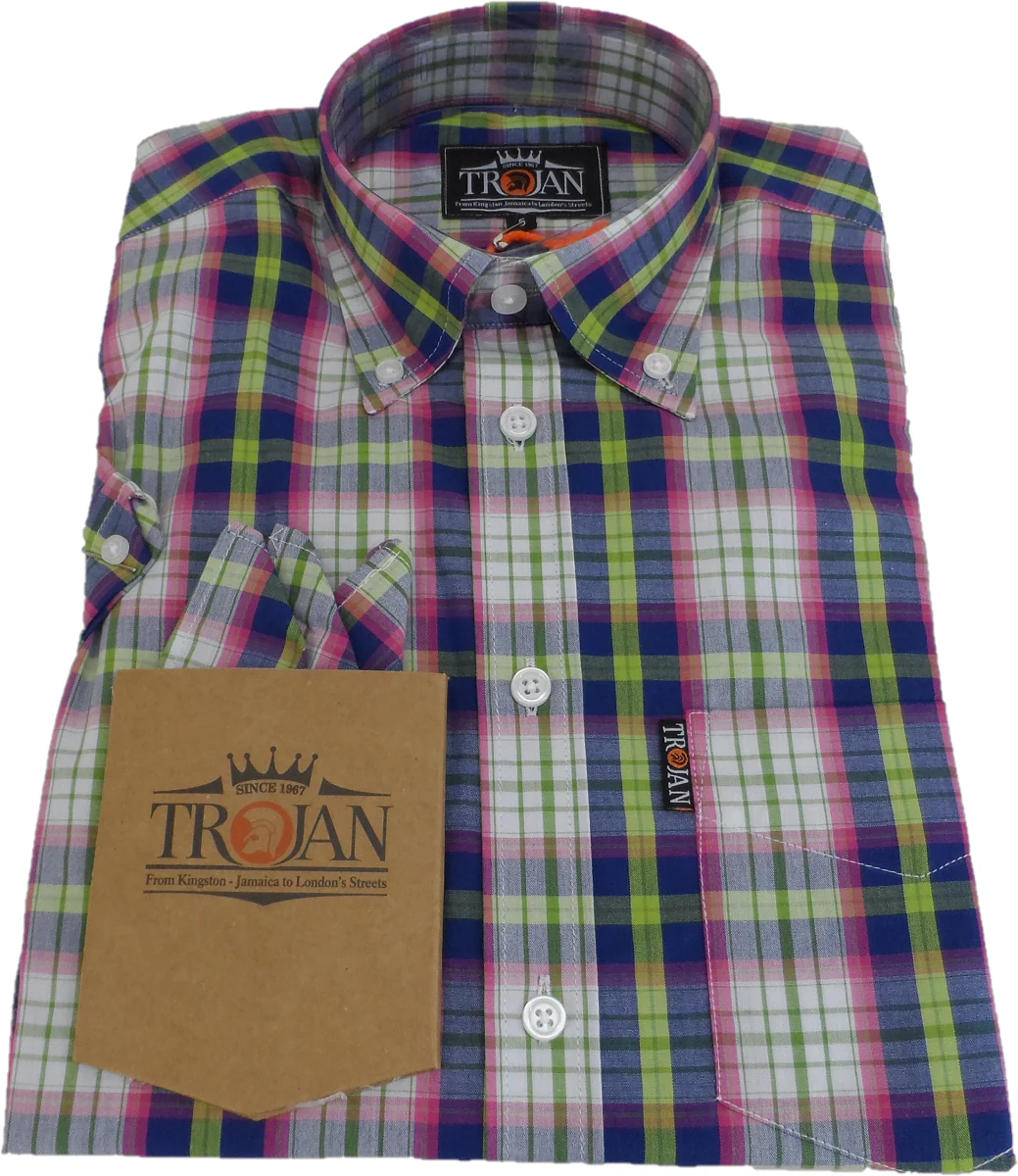 Classic check button-down shirt, with matching check pocket square, in soft-handle Cotton, with 3-finger roll button down collar, chest pocket (with ‘Trojan’ tab label), short sleeve with v-insert and twin button detail, with back collar button/tab detail and full length stitched back placket with loop.